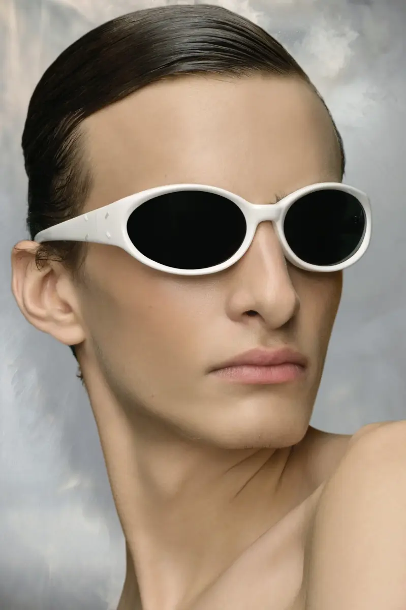 The Maison Margiela x Gentle Monster collaboration presents the eyewear brand’s original designs incorporating real threaded details of the Maison’s signature four stitches on the temple; the opposite of a label. The MM104 is a minimal oval-shaped model, which comes in acetate showcasing the brands’ experimental craftsmanship.