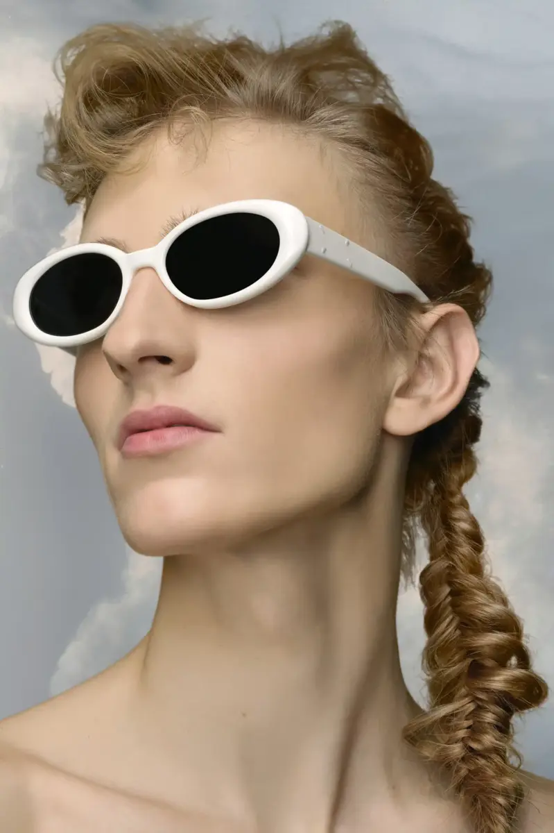 The Maison Margiela x Gentle Monster collaboration presents the eyewear brand’s original designs incorporating real threaded details of the Maison’s signature four stitches on the temple; the opposite of a label. The MM107 is a chunky oval-shaped model, which comes in acetate. The design is testament to the brands’ shared belief in experimental craftsmanship.