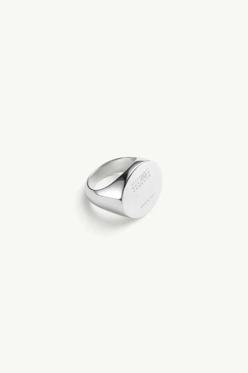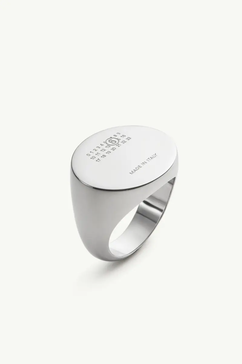 This signet-style ring is defined by its clean oval surface and high-shine finish. Engraved with the MM6 numeric signature, it invites a second look while maintaining a pared-back presence.