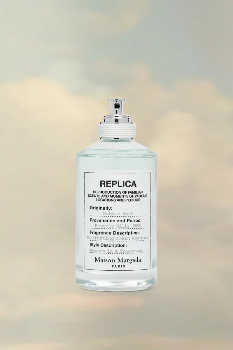 “Replica Bubble Bath eau de toilette captures the relaxing memory and intimate moment of pure wellness, relaxing in a foaming, scented bath. Clean, cocooning and relaxing, the scent transports you to plunging into bubbles, feeling your body soothe from tension – an exquisite me-time moment. The floral olfaction is created with soap bubbles accord, coconut milk accord, rose superessence and white musks. Size 100ml. The Replica collection assembles iconoclast fragrances that have the universal power to trigger personally cherished moments. True to its ‘creative collective’ approach, Maison Margiela collaborates with the best perfumers, chosen for their genuine connection with the memory, stimulated by the artistic performance of composing a fragrance asa universal invitation to awaken, celebrate and share unforgettable feelings and emotions. In line with the Maison’s minimalistic approach, the Replica bottle is simple yet sophisticated. A cotton label, resembling the tags used on clothing and accessories for the Replica fashion collection, identifies each fragrance.”