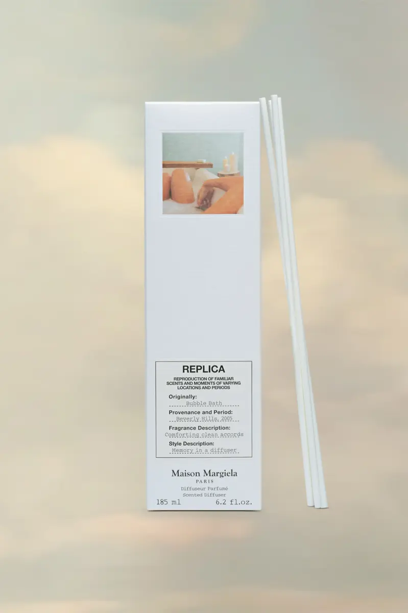 Replica Bubble Bath scented diffuser captures the relaxing memory and intimate moment of pure wellness, relaxing in a foaming, scented bath. Clean, cocooning and relaxing, the scent transports you to plunging into bubbles, feeling your body soothe from tension – an exquisite me-time moment. The floral olfaction is created with soap bubbles accord, coconut milk accord, rose superessence and white musks. The diffusion of the scent is continuous during 4 months with no action required and the intensity of the diffusion can be adjusted by modifying the number of sticks. Size 185ml. The Replica collection assembles iconoclast fragrances that have the universal power to trigger personally cherished moments. In line with the Maison’s minimalistic approach, the Replica diffuser is simple yet sophisticated. A label resembling the tags used on clothing and accessories for the Replica fashion collection, identifies each fragrance.