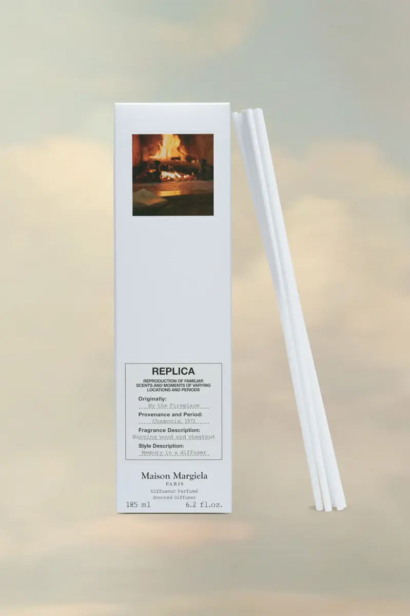 Replica By the Fireplace scented diffuser is reminiscent of the enveloping sensation of a fireplace in the midst of winter. Warm, woody and sweet, the scent takes you to a place where the flames crackle on a comforting fire, the cosy veil of grilled chestnuts fill the air while it’s snowing outdoors across a frosty landscape. The Maison recreates this mood as a scent with addictive chestnut accord, red berries, clove oil and cashmeran. The diffusion of the scent is continuous during 4 months with no action required and the intensity of the diffusion can be adjusted by modifying the number of sticks. Size 185ml. The Replica collection assembles iconoclast fragrances that have the universal power to trigger personally cherished moments. In line with the Maison’s minimalistic approach, the Replica diffuser is simple yet sophisticated. A label resembling the tags used on clothing and accessories for the Replica fashion collection, identifies each fragrance.