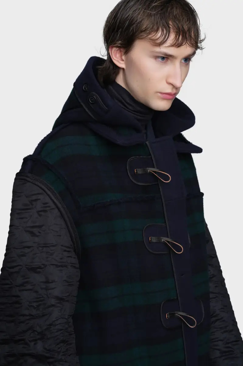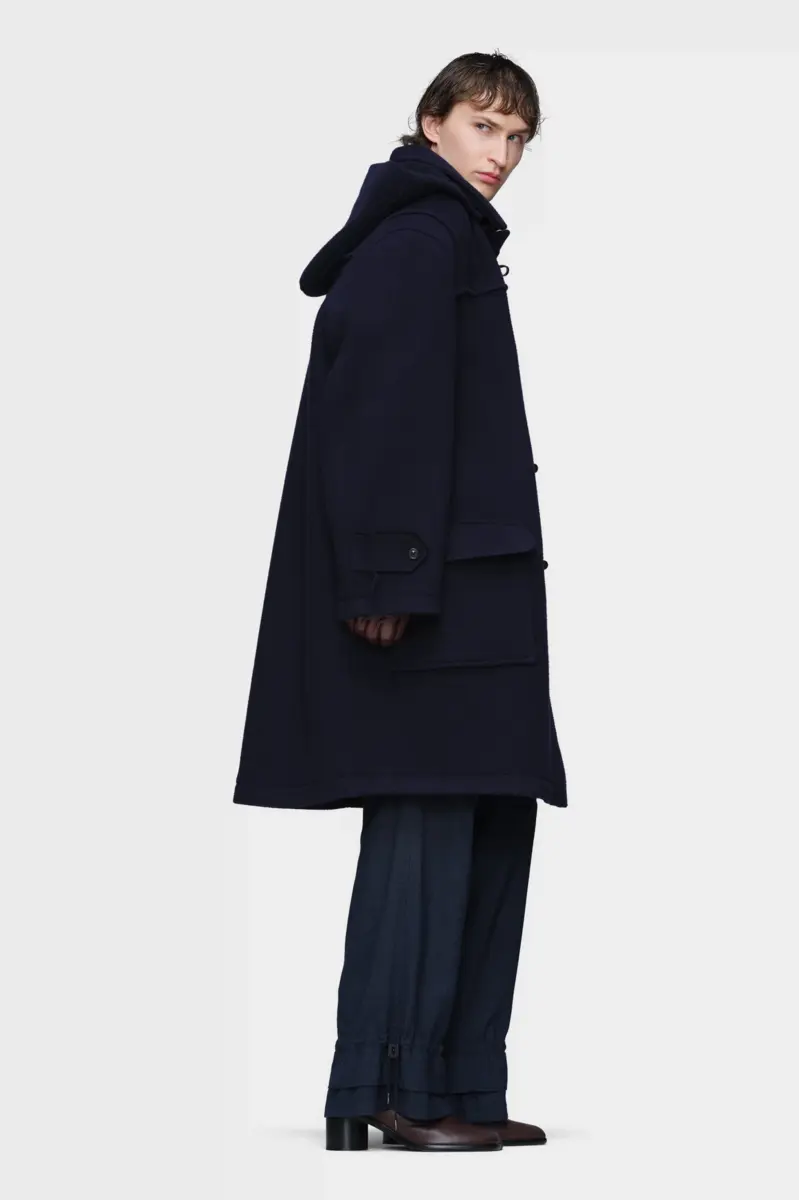 This dual-wear duffle coat is cut from wool with an elongated silhouette, dropped shoulders and a removable hood. Toggle fastenings reference classic outerwear, while deep patch pockets add everyday function. Reversible by design, the piece offers two interpretations of the same form. Maison Margiela’s signature, the four stitches, appear at the back; the opposite of a label.