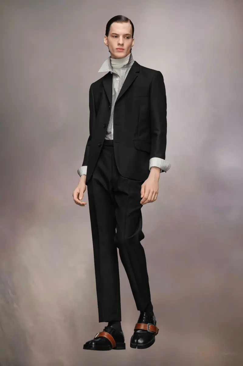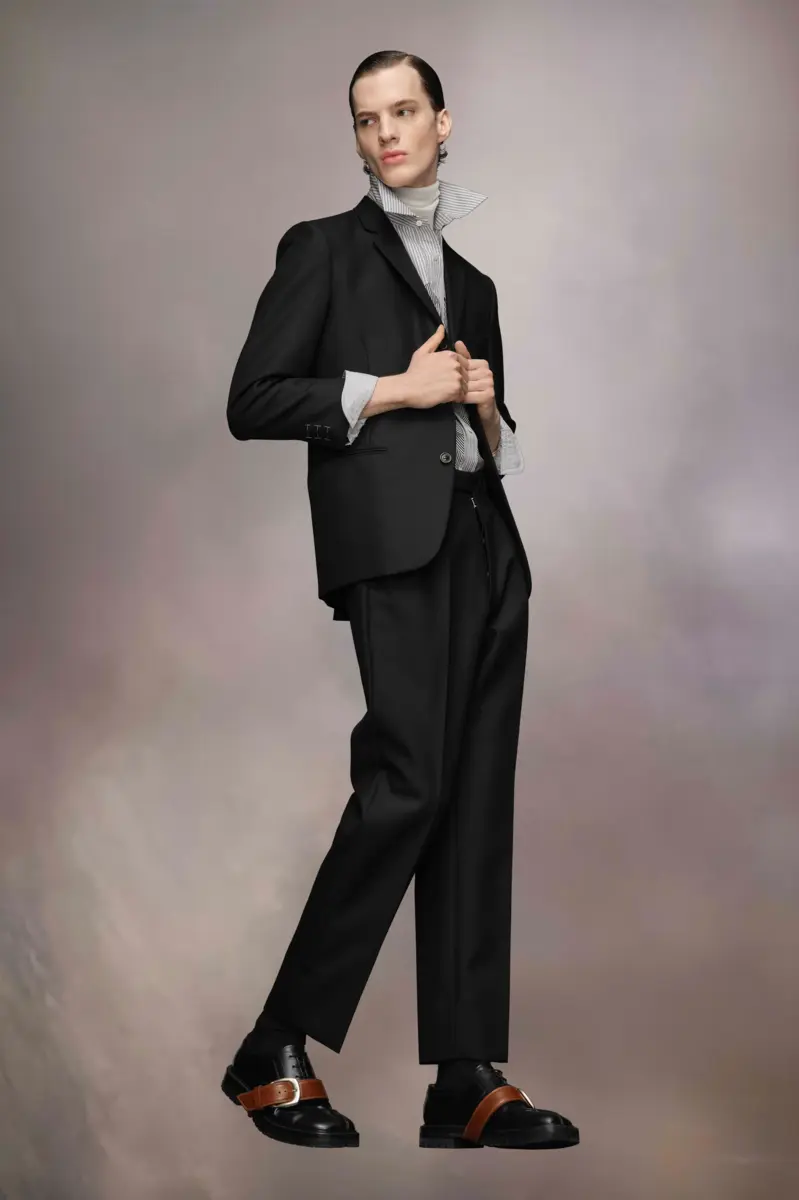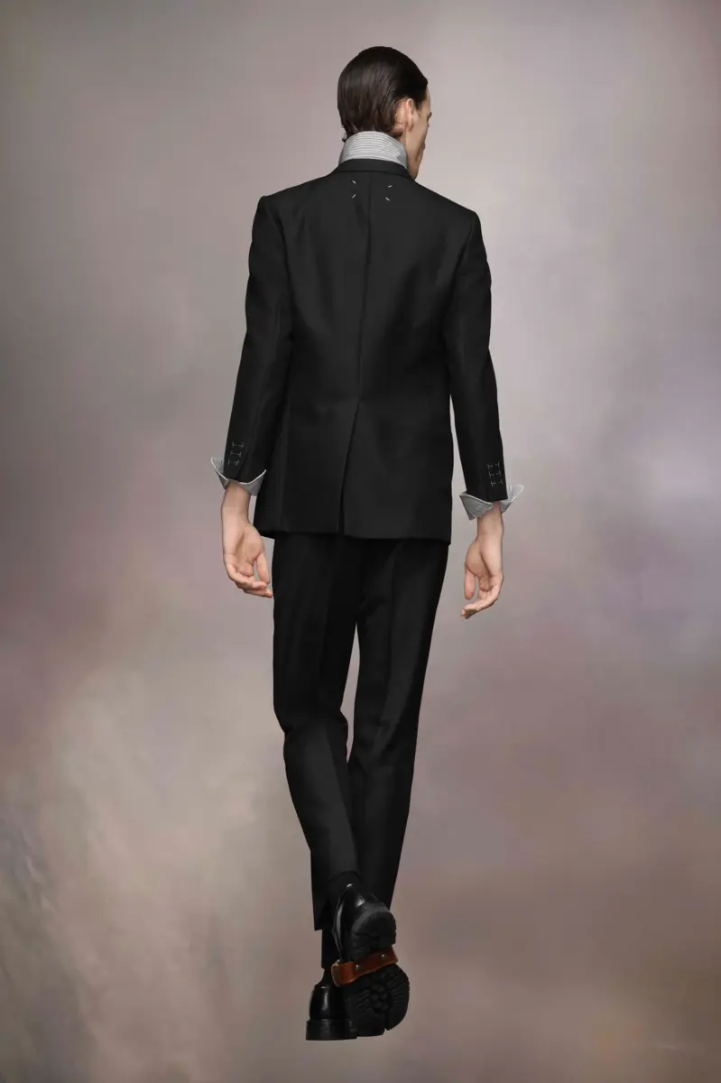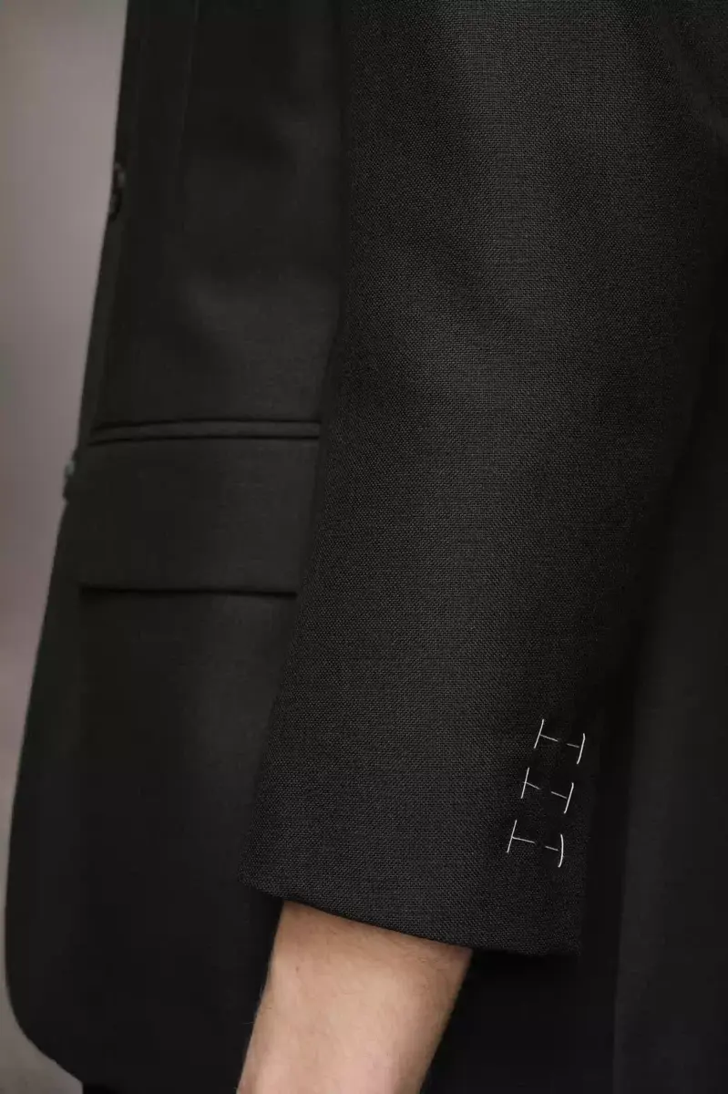 Crafted from British mohair, the blazer is single-breasted with three buttons. A back vent offers movement, while the front has a notched collar and flap pockets. The Maison’s Work-in-progress stitches are seen at the cuffs for an unfinished aesthetic that offsets the classic tailoring. Maison Margiela’s signature, the Four stitches, appear at the back; the opposite of a label.