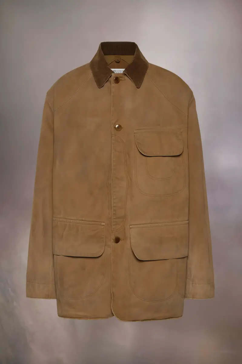 In cotton with a corduroy collar, the waxed coat features three large flap pockets and button closure. It has a relaxed fit. Maison Margiela’s signature, the Four stitches, appear at the back; the opposite of a label.