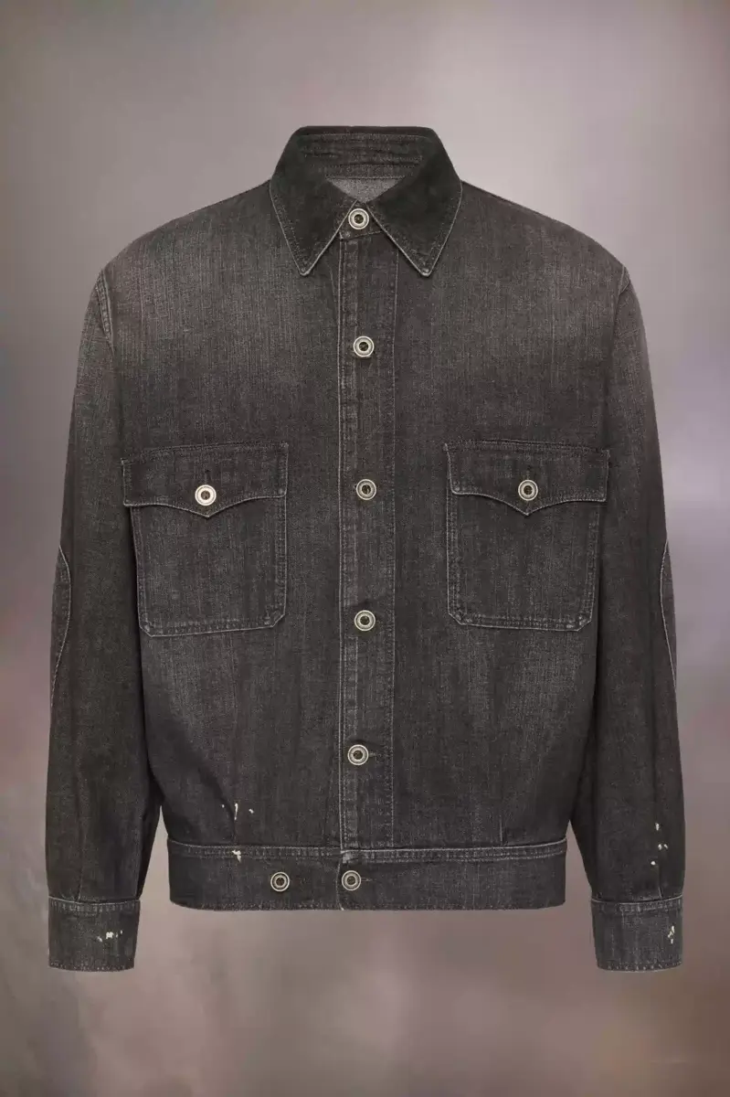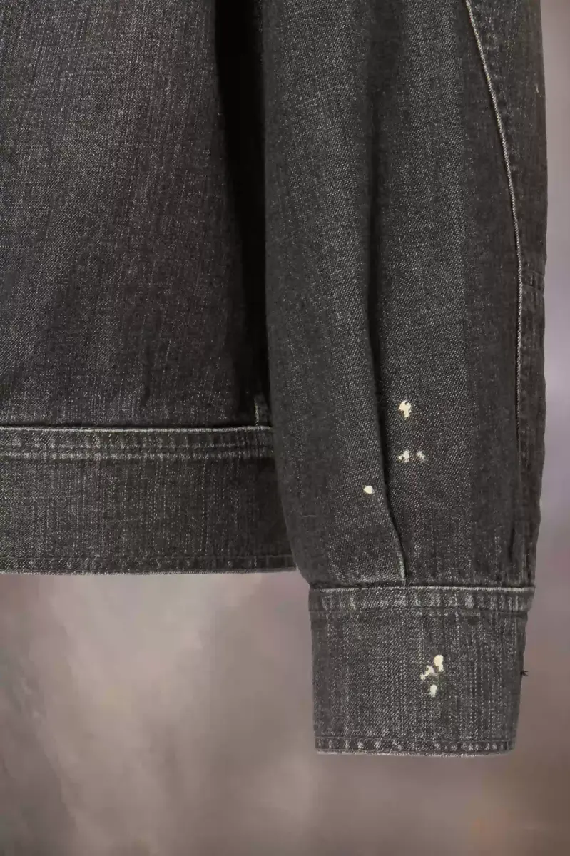 In a stonewashed finish with paint splatters for a lived-in aesthetic, the denim jacket features buttoned chest pockets, additional button to the waistband, and topstitch. Tonal elbow patches add to the worn look. Maison Margiela’s signature, the four stitches, appear at the back; the opposite of a label.