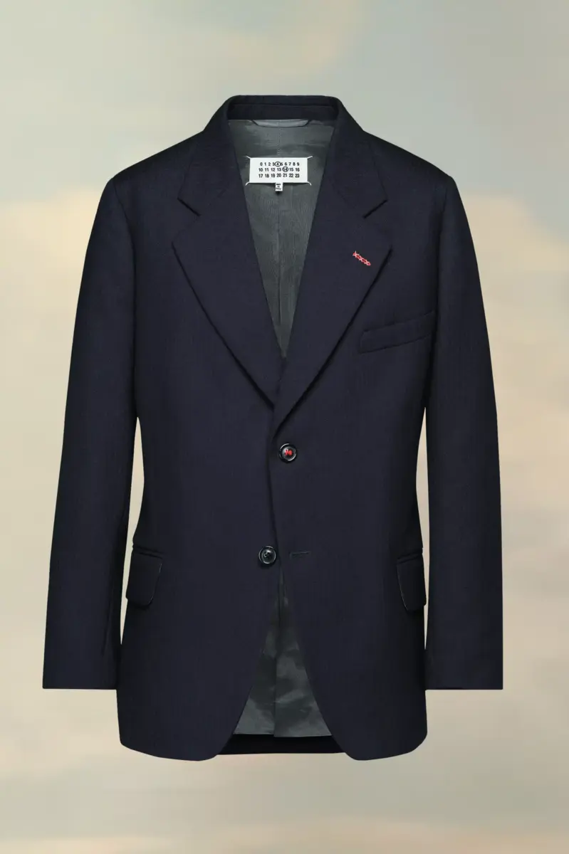 In herringbone wool, the single-breasted jacket features the Maison’s work-in-progress stitching on one side of the notched collar. The numeric logo appears inside.