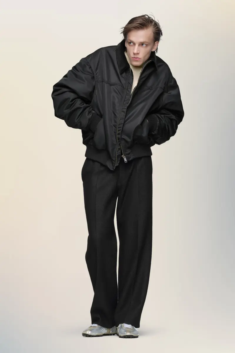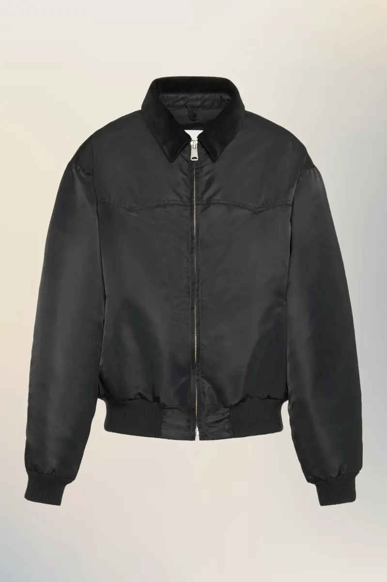 This caban jacket is defined by a rounded silhouette and padded construction. A corduroy collar bring subtle contrast, while ribbed edges frame the hem and cuffs. Designed with a zip closure and angled side pockets, it offers warmth with an architectural finish. At the back, the Maison’s signature four stitches appear; the opposite of a label.