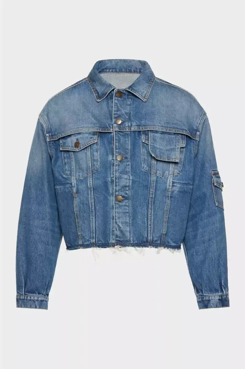 This denim jacket is cut with cropped proportions, offering a softened take on a classic shape. A single flap pocket at the elbow and a disrupted front pocket introduce subtle irregularity, while a raw hem underscores the Maison’s deconstructive approach. Maison Margiela’s signature, the four stitches, appear at the back; the opposite of a label.