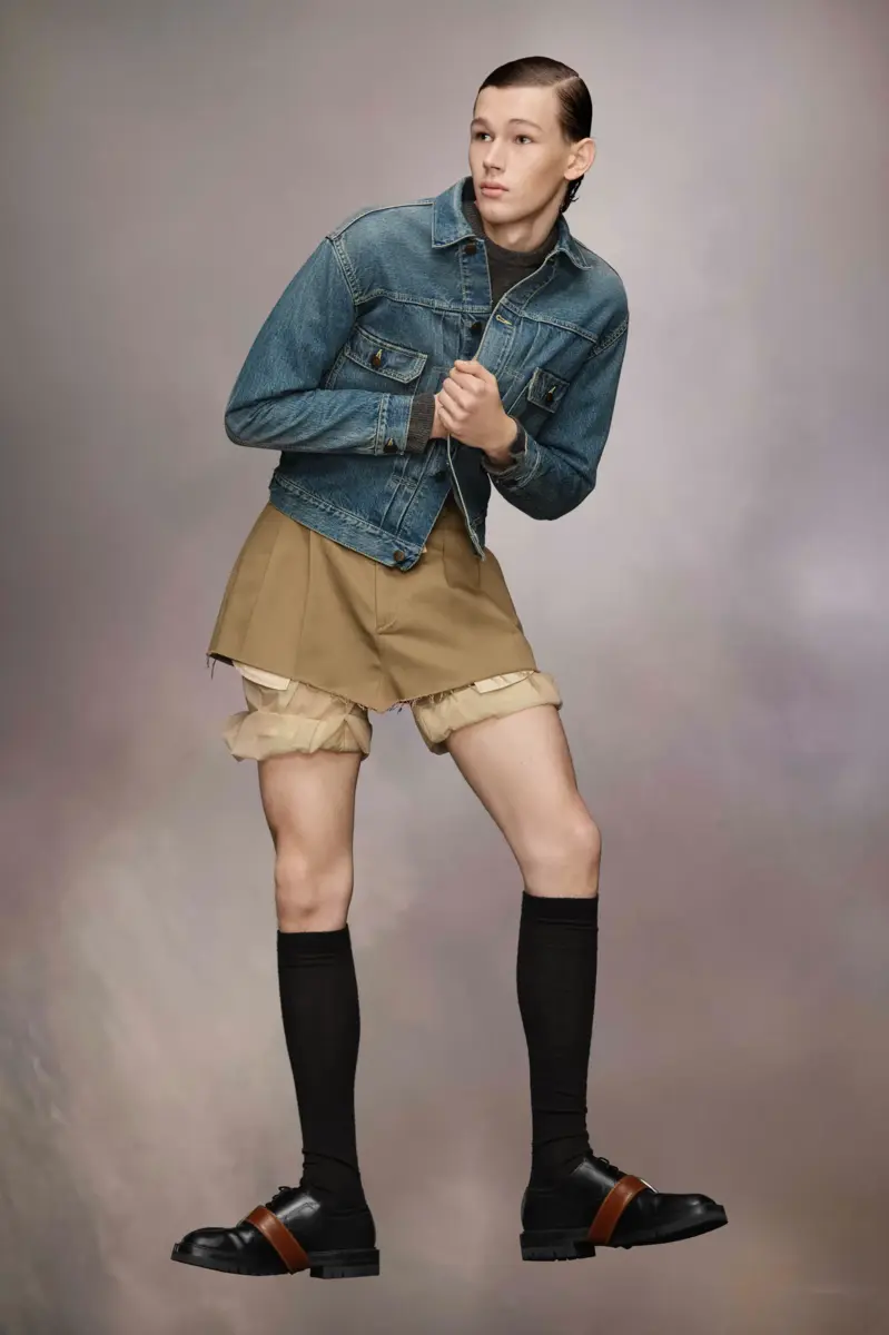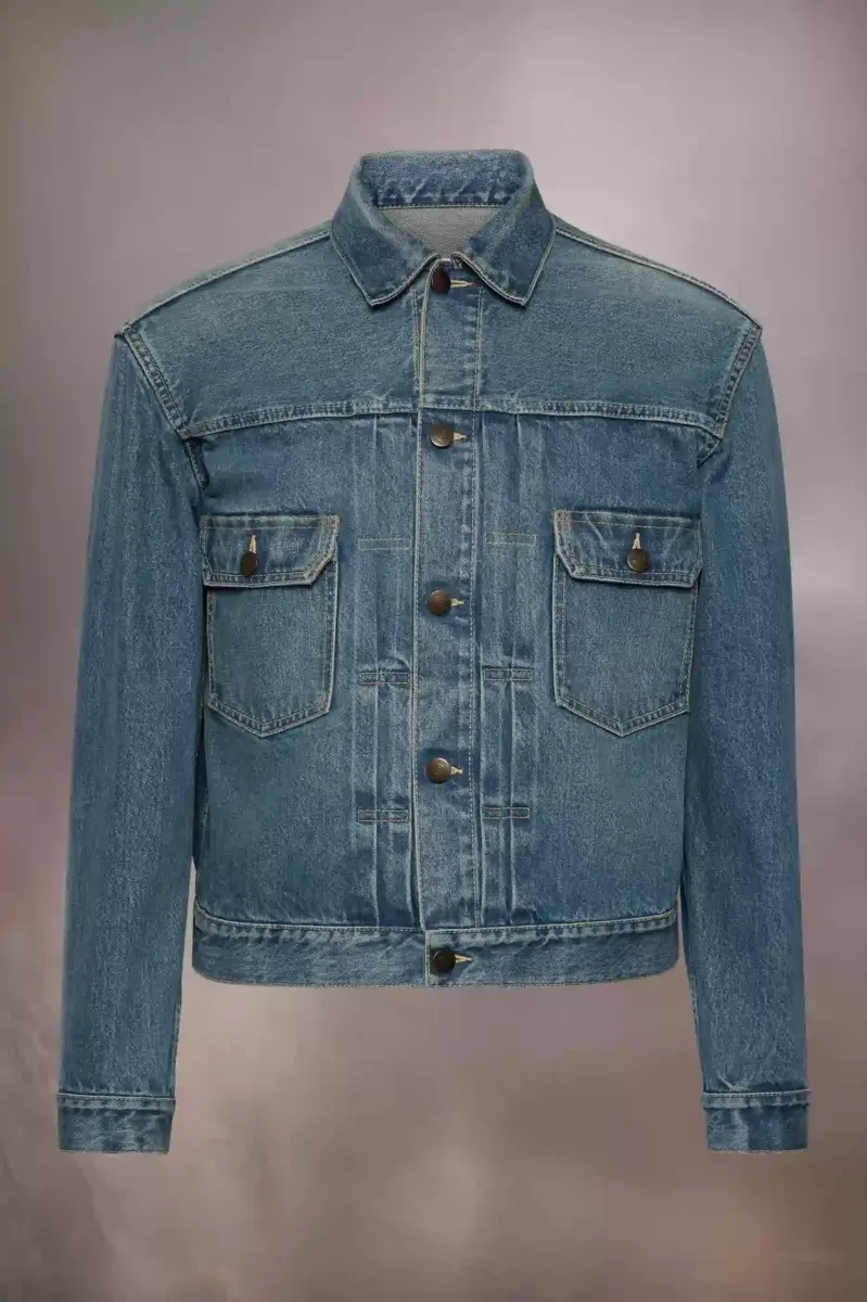 The fitted denim jacket features buttoned chest pockets and exposed stitching with pleat detail to the sides of the buttoned placket. Maison Margiela’s signature, the Four stitches, appear at the back; the opposite of a label.