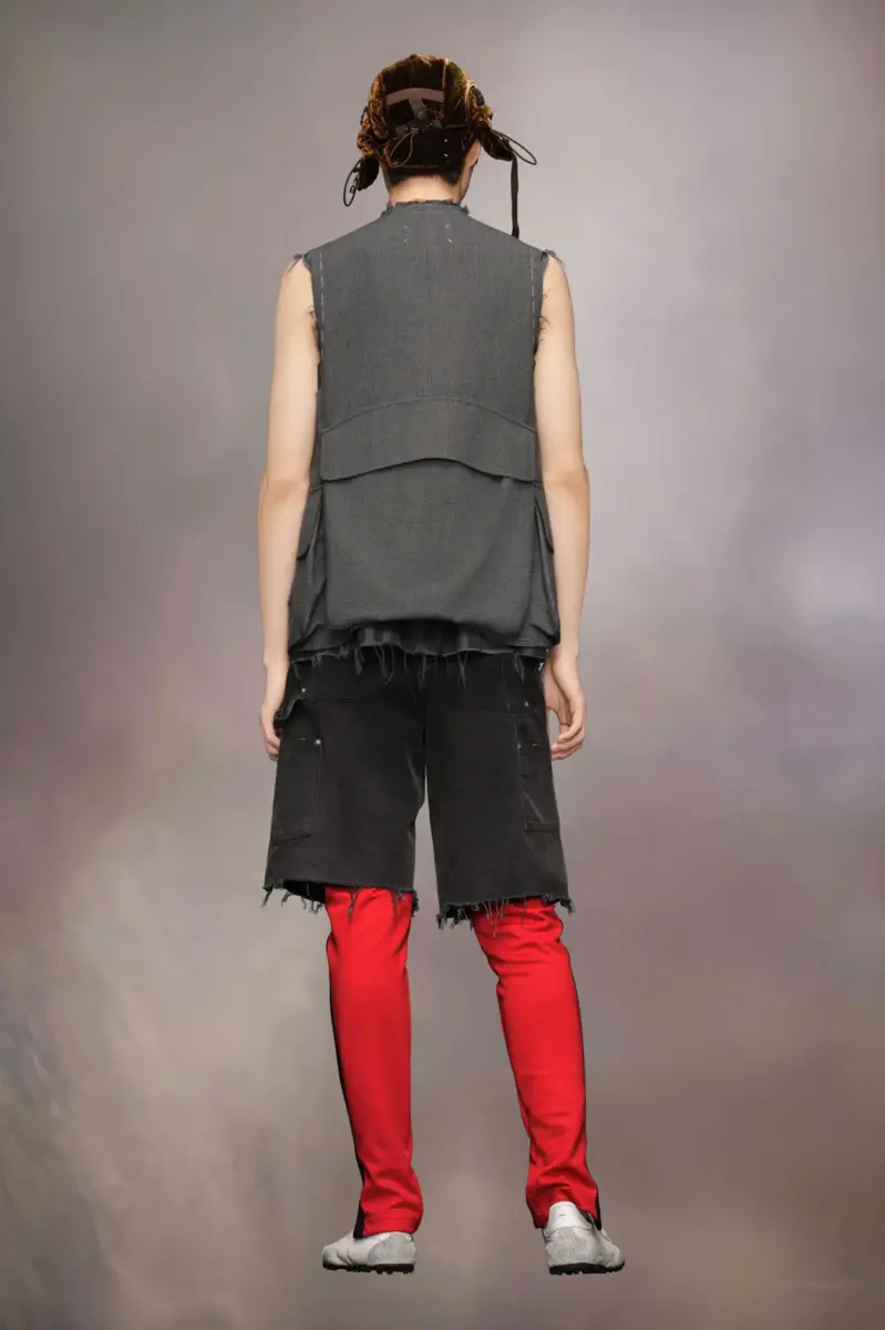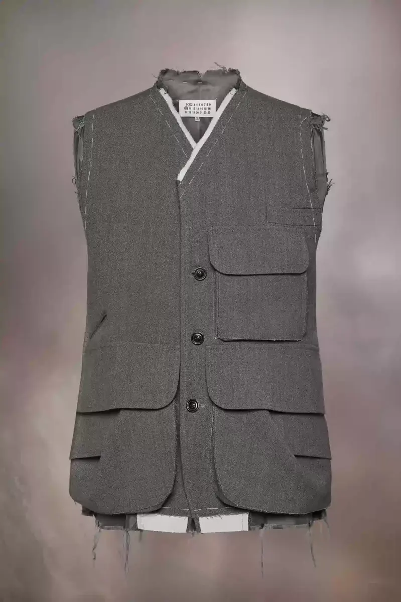 An example of the Maison’s work-in-progress approach, the sleeveless jacket is crafted from wool and features distressed edges and tack stitching. With a single-breasted, V-neck design, the jacket has a utilitarian focus with multi asymmetric pockets including a large flap pocket at the back. Maison Margiela’s signature, the four stitches, appear at the back; the opposite of a label.