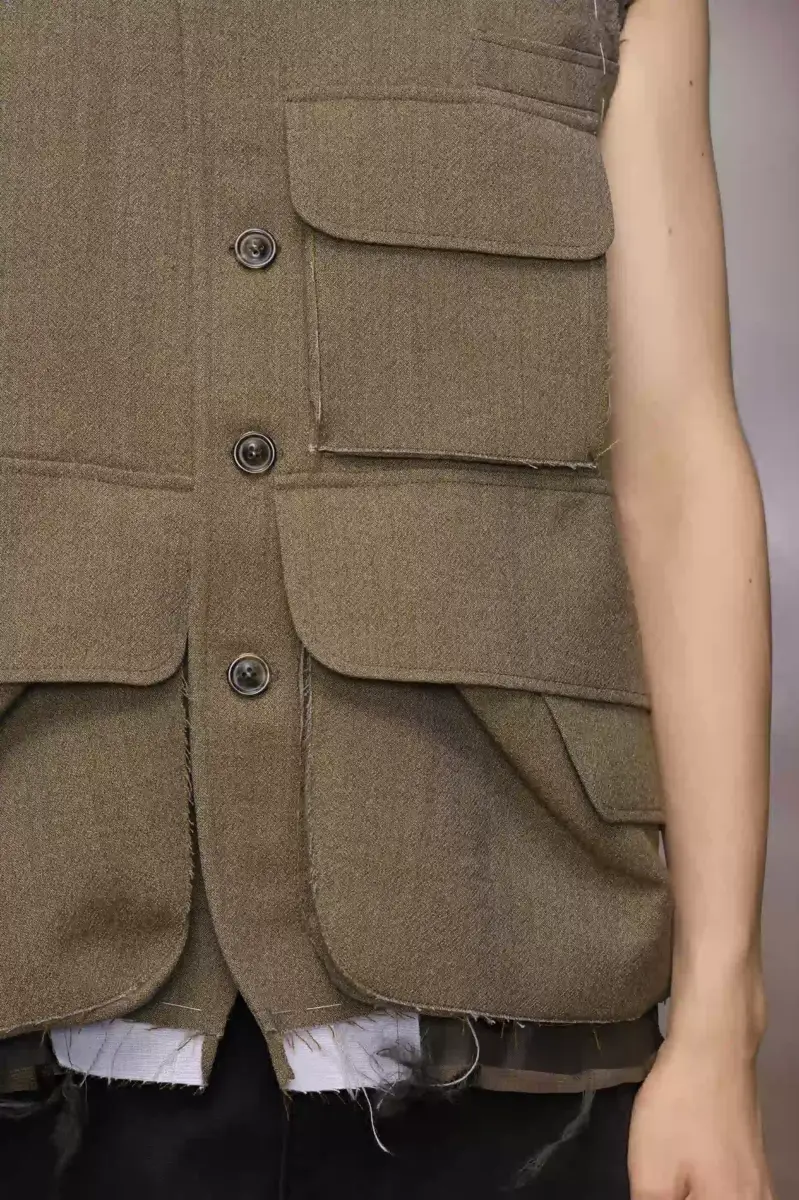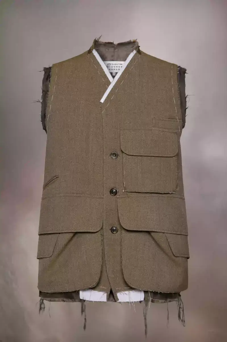 An example of the Maison’s work-in-progress approach, the sleeveless jacket is crafted from wool and features distressed edges and tack stitching. With a single-breasted, V-neck design, the jacket has a utilitarian focus with multi asymmetric pockets including a large flap pocket at the back. Maison Margiela’s signature, the four stitches, appear at the back; the opposite of a label.