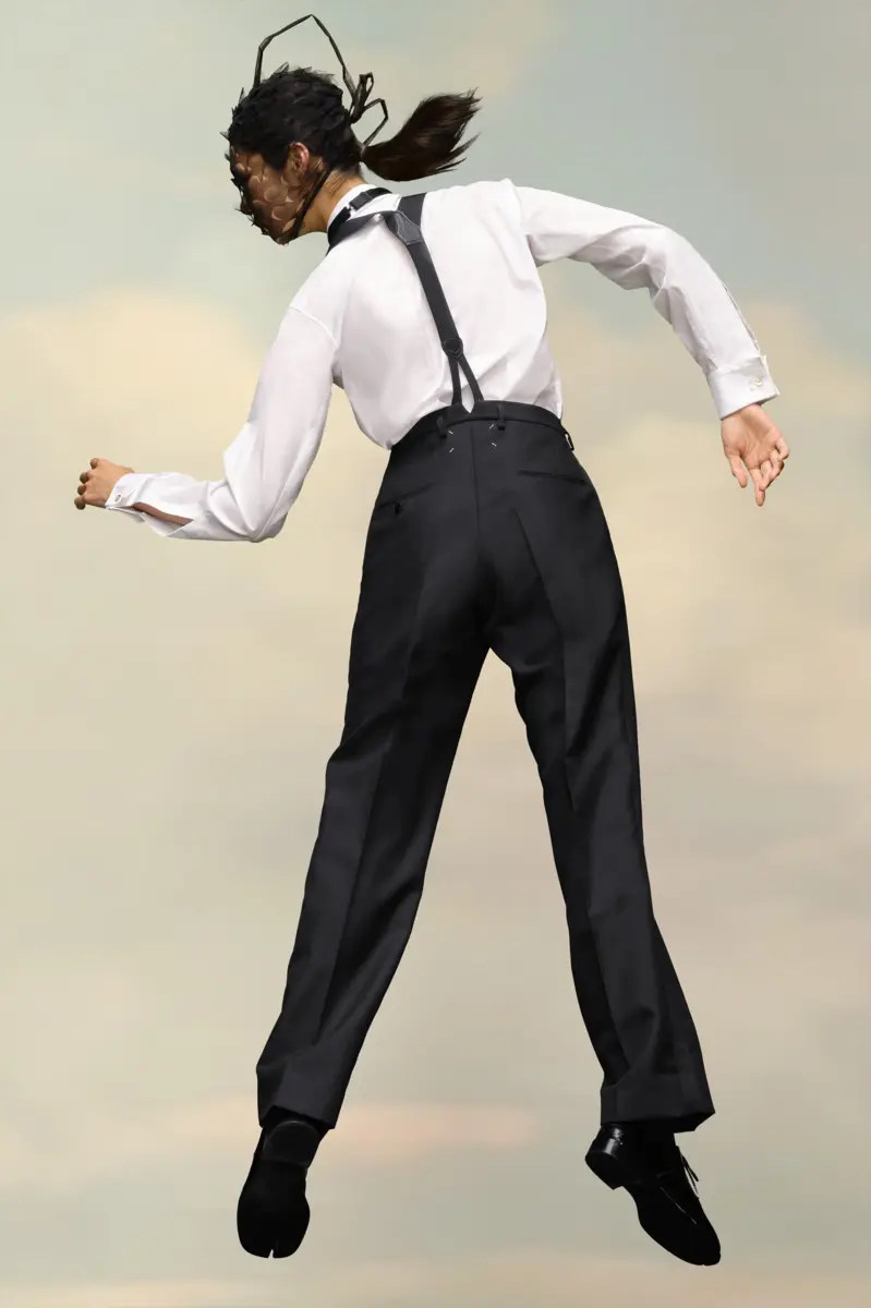 The pleated trousers in British mohair have a contrast stripe down the sides, belt loops and a small cut-out at the back. They’re complete with two back pockets. Maison Margiela’s signature, the four stitches, appear at the back; the opposite of a label.