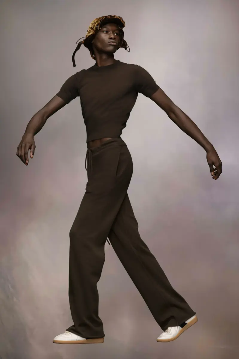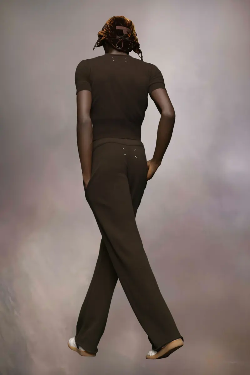 The tracksuit trousers are crafted from a soft cashmere wool blend. Designed as loungewear, they feature a ribbed waistband with extra-long drawstring for an adjustable fit. The trousers are designed with side pockets and a straight-leg, lightly pooling at the floor for a relaxed take. Maison Margiela’s signature, the four stitches, appear at the back; the opposite of a label.