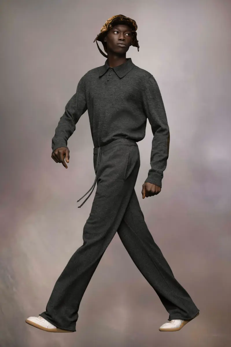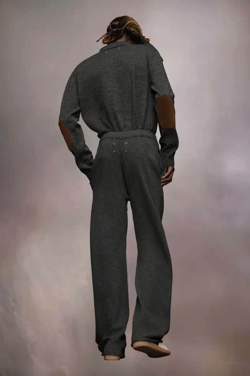The tracksuit trousers are crafted from a soft cashmere wool blend. Designed as loungewear, they feature a ribbed waistband with extra-long drawstring for an adjustable fit. The trousers are designed with side pockets and a straight-leg, lightly pooling at the floor for a relaxed take. Maison Margiela’s signature, the four stitches, appear at the back; the opposite of a label.