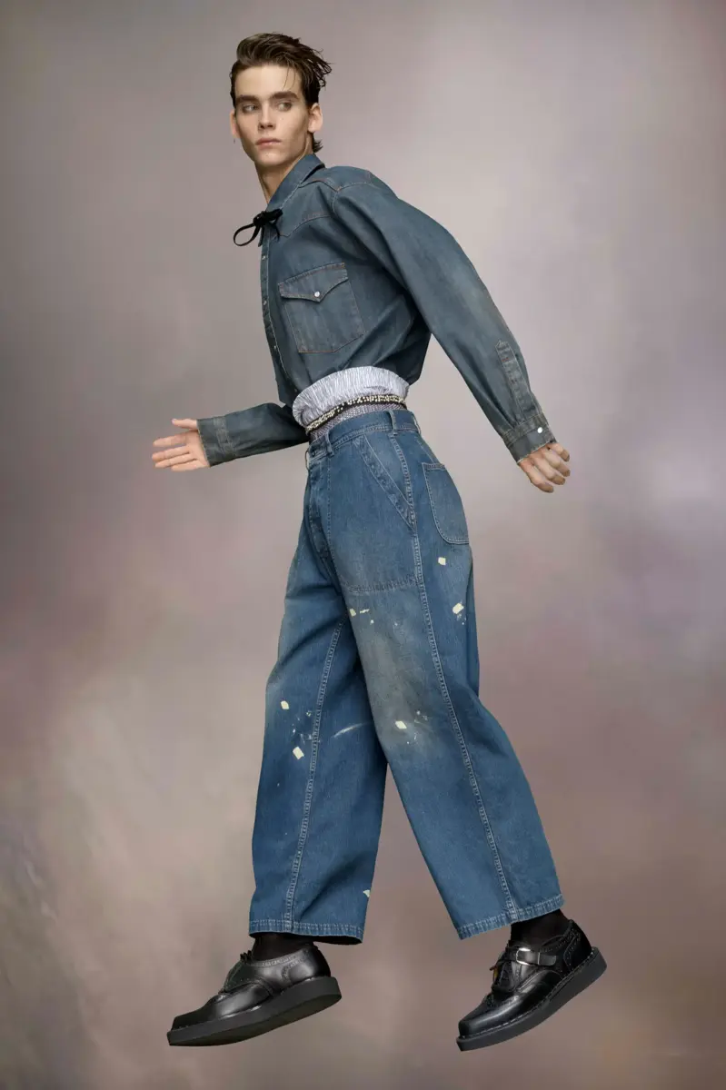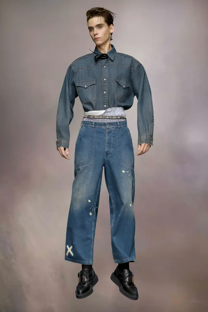 The straight-leg jeans with long front pockets feature distressed details for an undone aesthetic, including a printed X and paint splatters. Maison Margiela’s signature, the Four stitches, appear at the back; the opposite of a label.