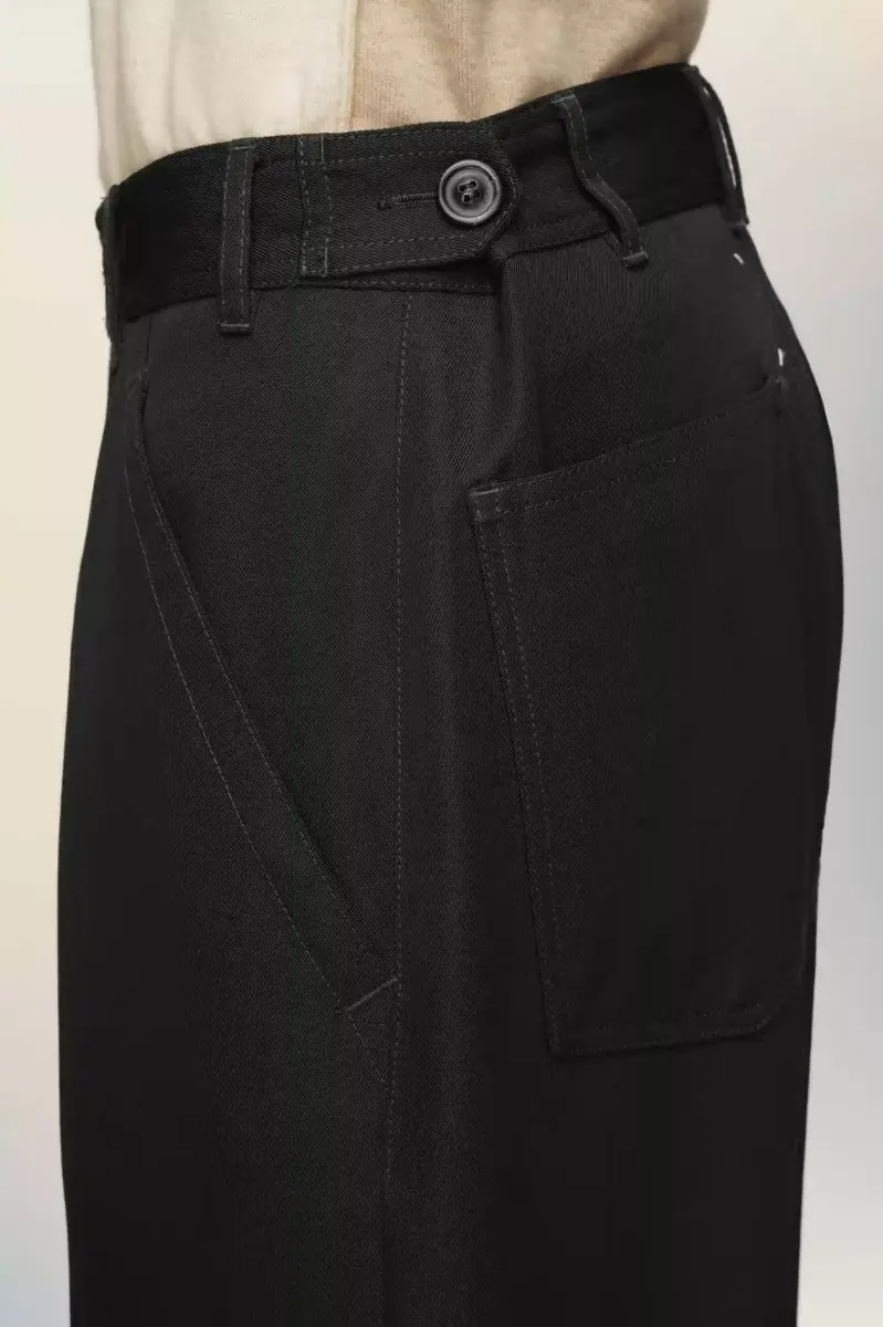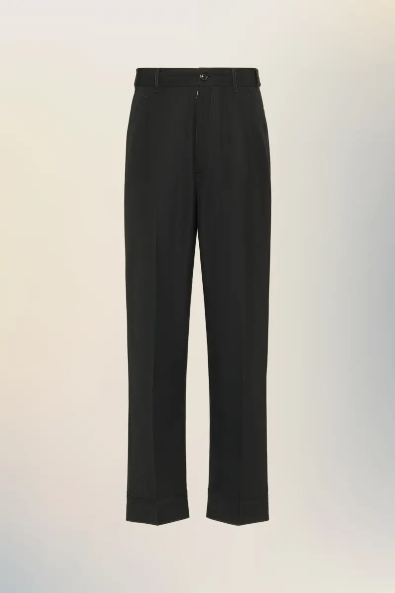 These wide-leg trousers feature crisp pleats, a high waistband, and neatly cuffed hems. Rear patch pockets and adjustable side tabs strike a balance between function and form. At the back, the Maison’s signature four stitches appear; the opposite of a label.