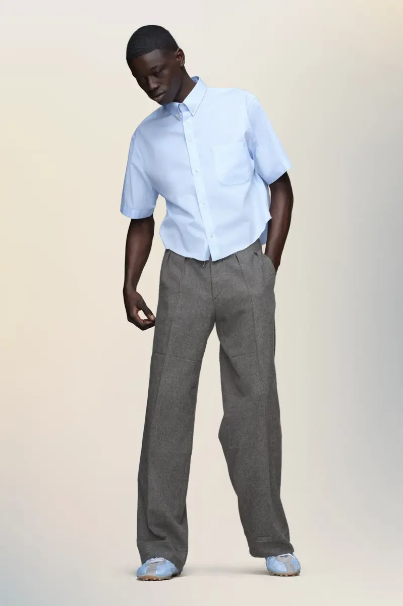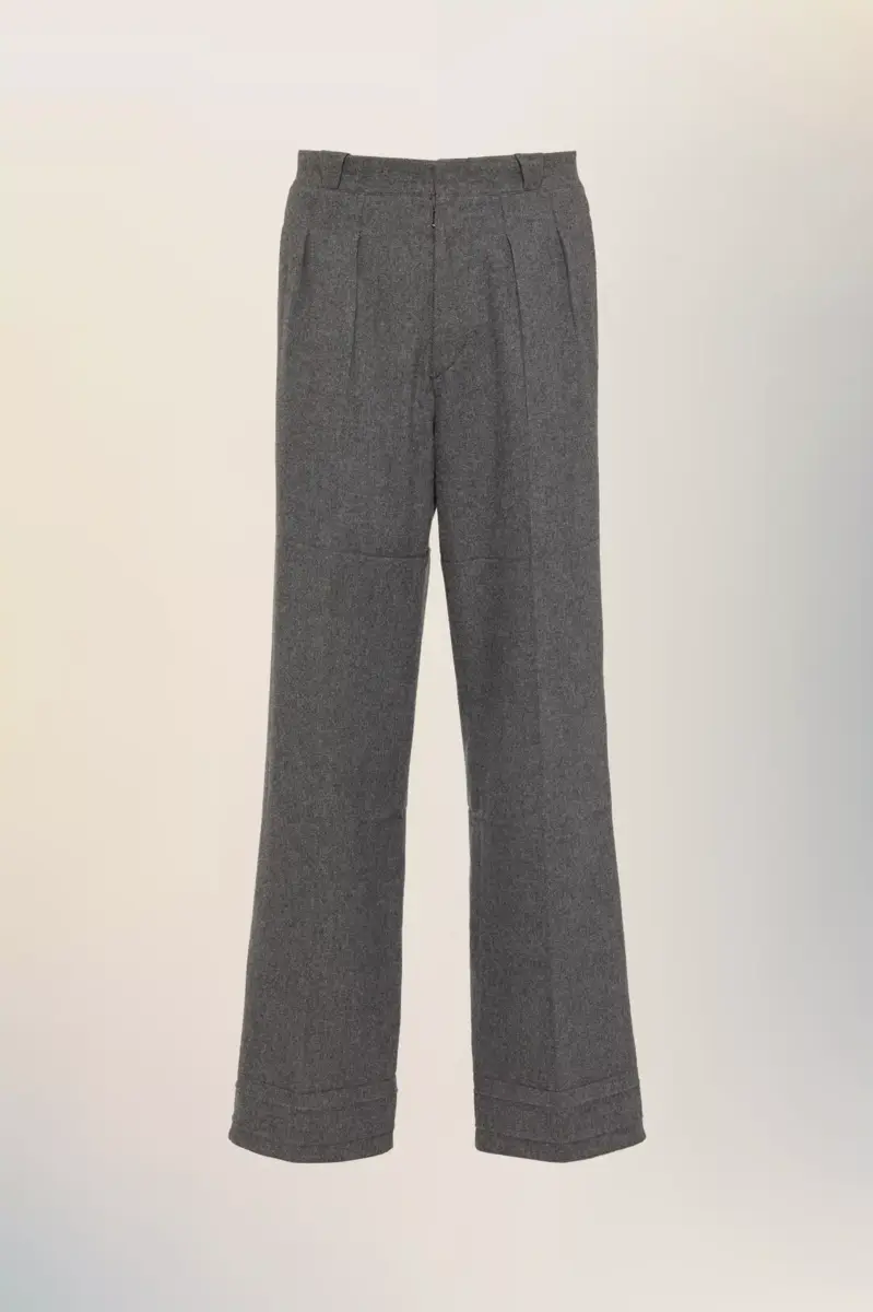 These tailored trousers feature soft pleats, subtle seam detailing and are finished with the memory of the hem technique. The clean lines and slightly flared leg reflect the Maison’s elevated interpretation of equestrian dress codes. Maison Margiela’s signature, the four stitches, appear at the back; the opposite of a label.