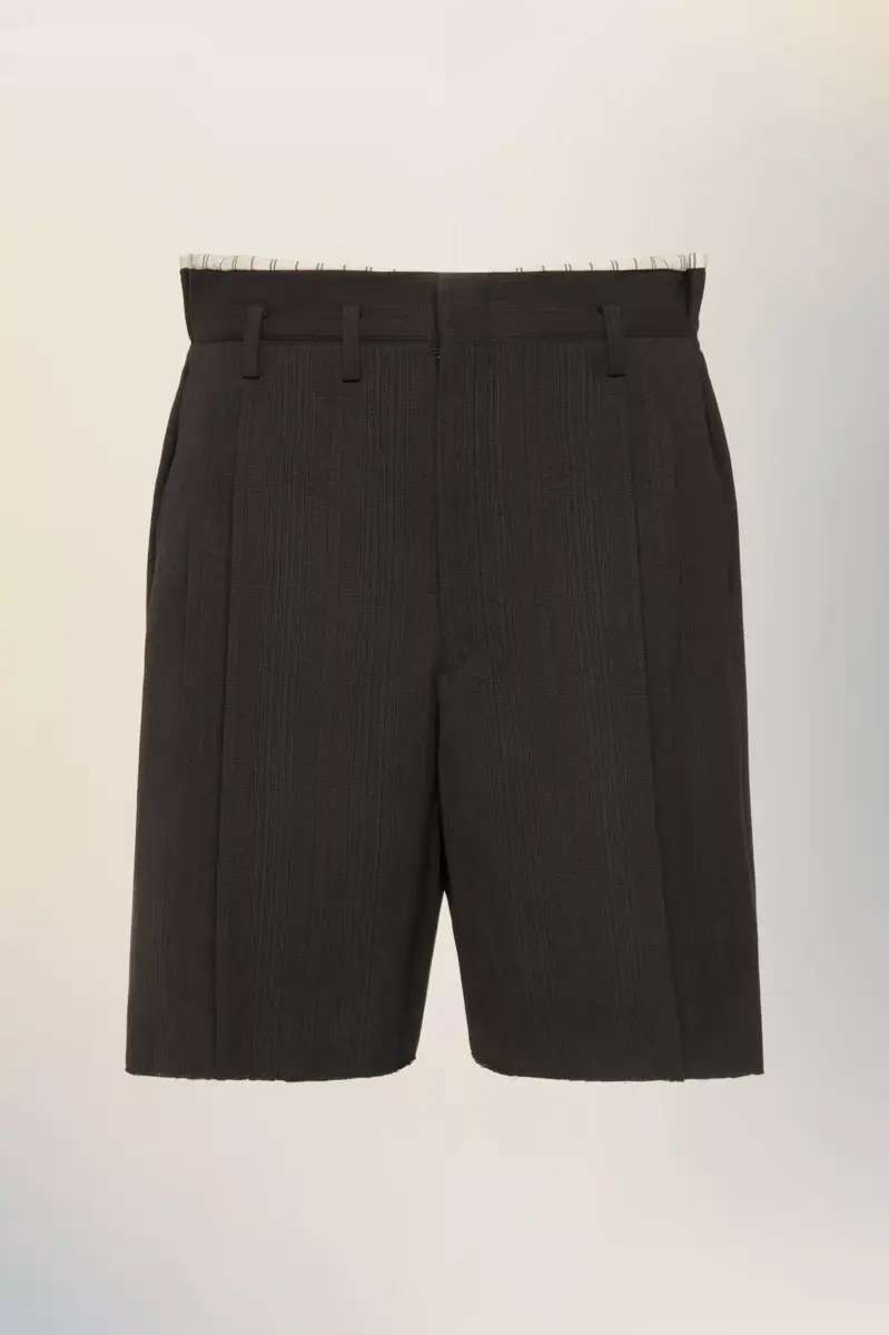 These tailored shorts feature crisp pleats and an unfinished hem. A striped interior at the waistband offers a quiet take on Anonymity of the Lining – a house code that subtly inverts expectation. Maison Margiela’s signature, the four stitches, appear at the back; the opposite of a label.