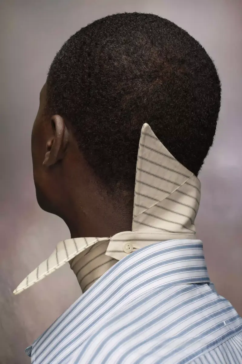 Crafted from cotton, the collar accessory has a pointed design with a single button fastening and stripe print. It can be worn in its traditional form or popped to the side. The numeric logo appears on the inner, with number 1 and 10 encircled (womenswear and menswear collections) indicating its genderless nature.