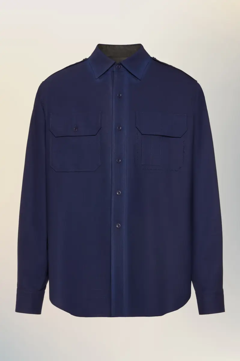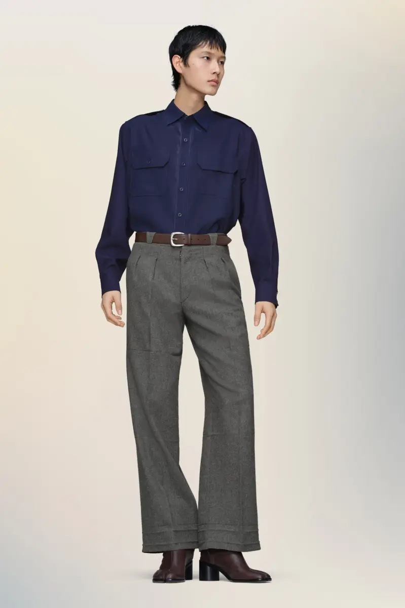 Defined by flap patch pockets – one rendered with disrupted stitching – this shirt showcases the Maison’s attention to the process of construction. Epaulettes at the shoulders hint at uniform codes, while the fabric is transformed through the Pressed to Death technique: a treatment of heat, pressure and handpainting. Maison Margiela’s signature, the four stitches, appear at the back; the opposite of a label.