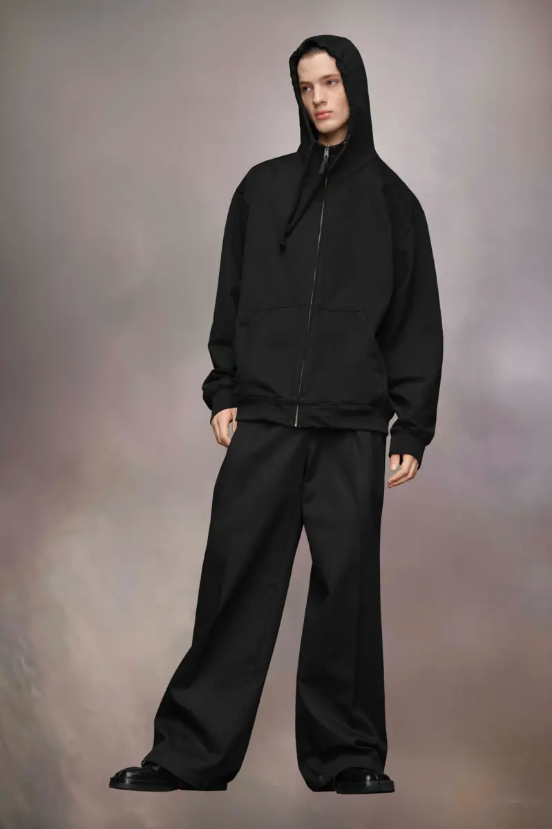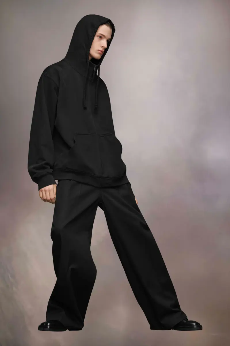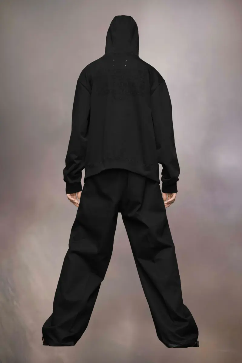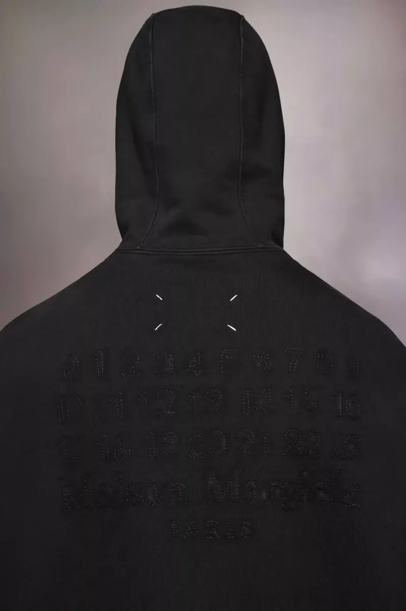 The hooded sweatshirt comes in firm cotton fleece with a zip closure and split kangaroo pocket at the front. The back features tonal Maison Margiela reverse embroidery. Maison Margiela’s signature, the Four stitches, also appear at the back; the opposite of a label.