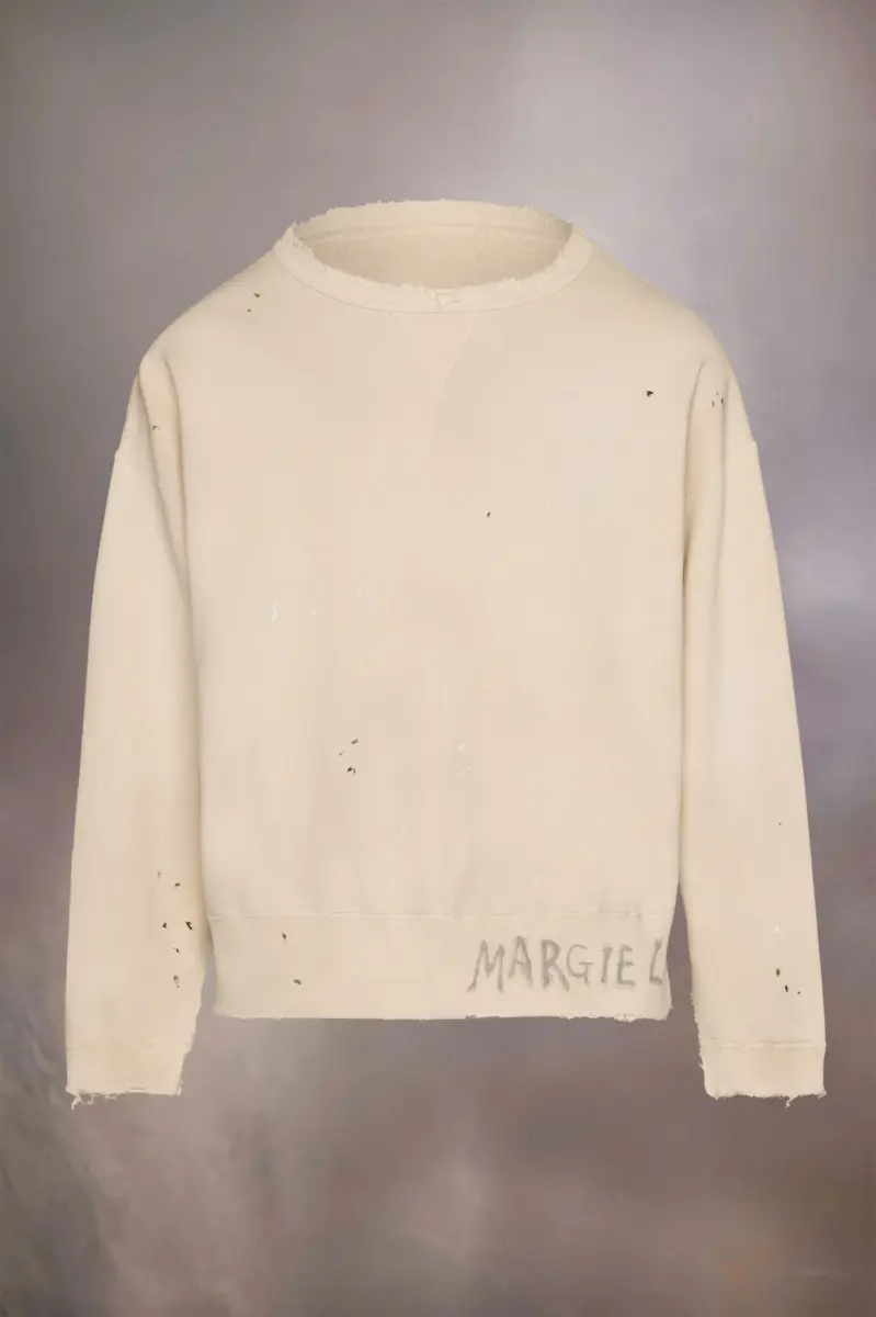 In organic cotton fleece, the round-neck sweatshirt features slashed long sleeves and a handwritten Margiela logo at the hem. Raw edges present an undone aesthetic. Maison Margiela’s signature, the Four stitches, appear at the back; the opposite of a label.