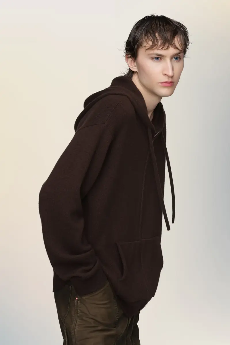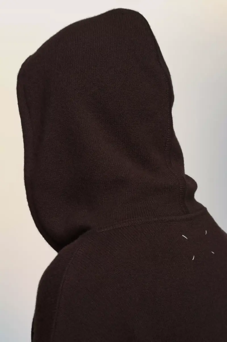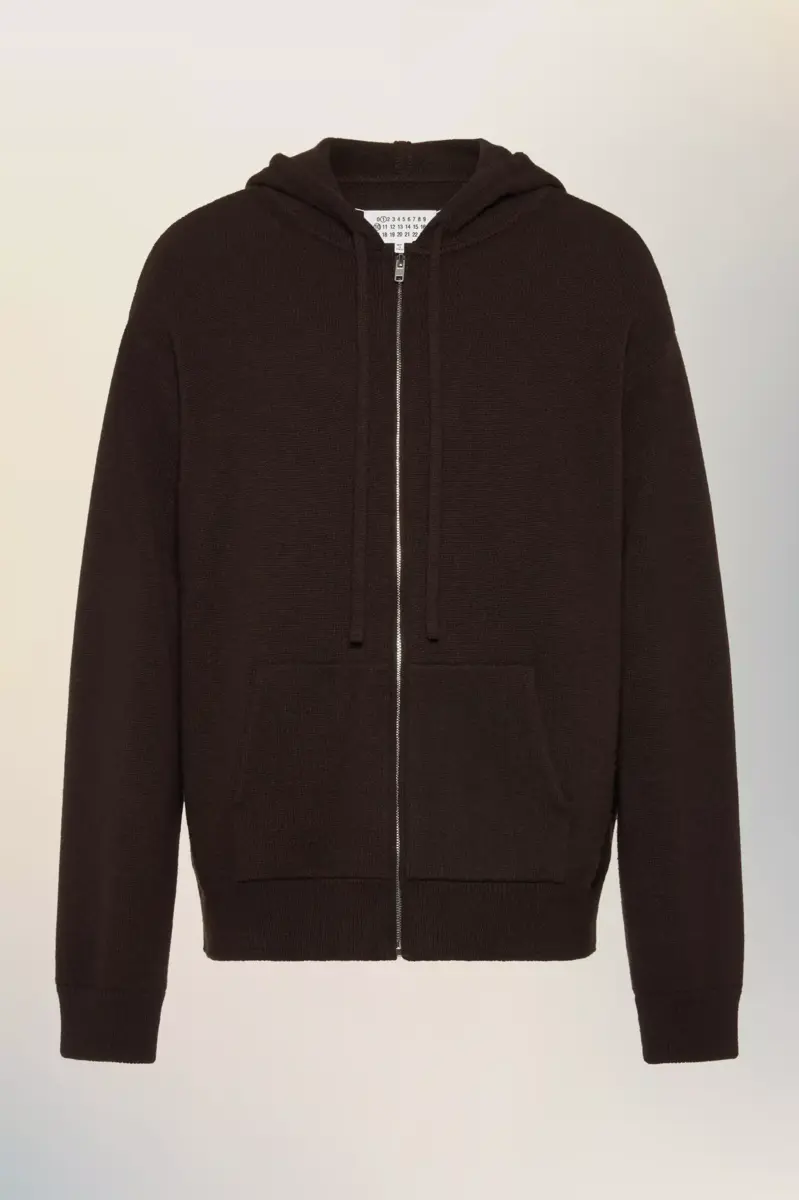 This soft, zip-up cashmere hooded sweater is shaped with relaxed fit. A ribbed hem and cuffs frame the silhouette, while patch pockets and a drawstring hood finish the design. Maison Margiela’s signature, the four stitches, appear at the back; the opposite of a label.