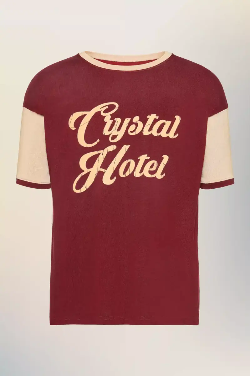 This two-tone t-shirt is printed with a retro “Crystal Hotel” logo in crackled print, echoing the nostalgic language of holiday memorabilia. Its soft construction and tonal collar draw from vintage athletic styles, reinterpreted with subtle disruption. Maison Margiela’s signature, the four stitches, appear at the back; the opposite of a label.