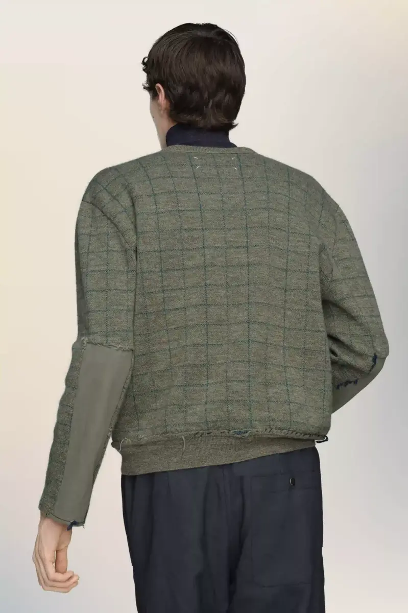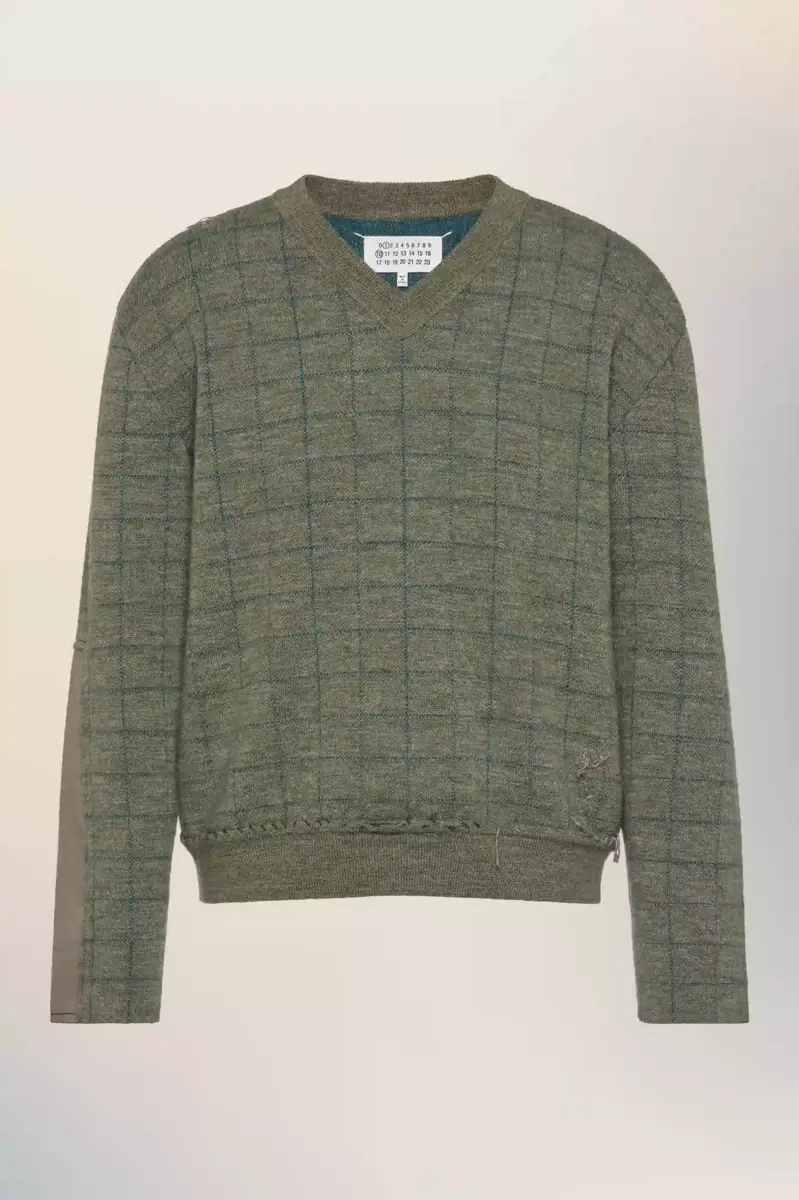 In a textured check design, this V-neck sweater reflects the collection’s reinterpretation of countryside archetypes. Knitted in Charles patching – a technique inspired by King Charles mending his own clothing – it features visible repair stitching and irregular finishing at the hem, a garment shaped by time and use. Maison Margiela’s signature, the four stitches, appear at the back; the opposite of a label.