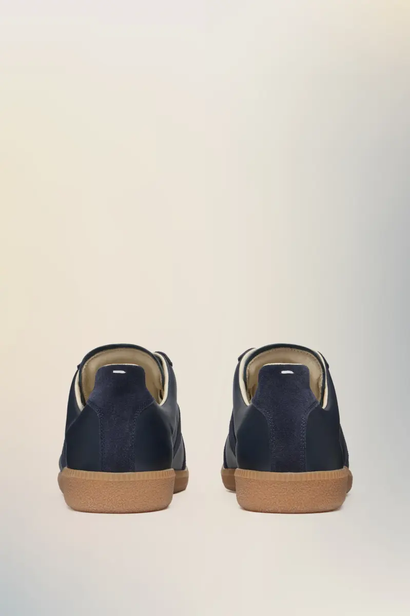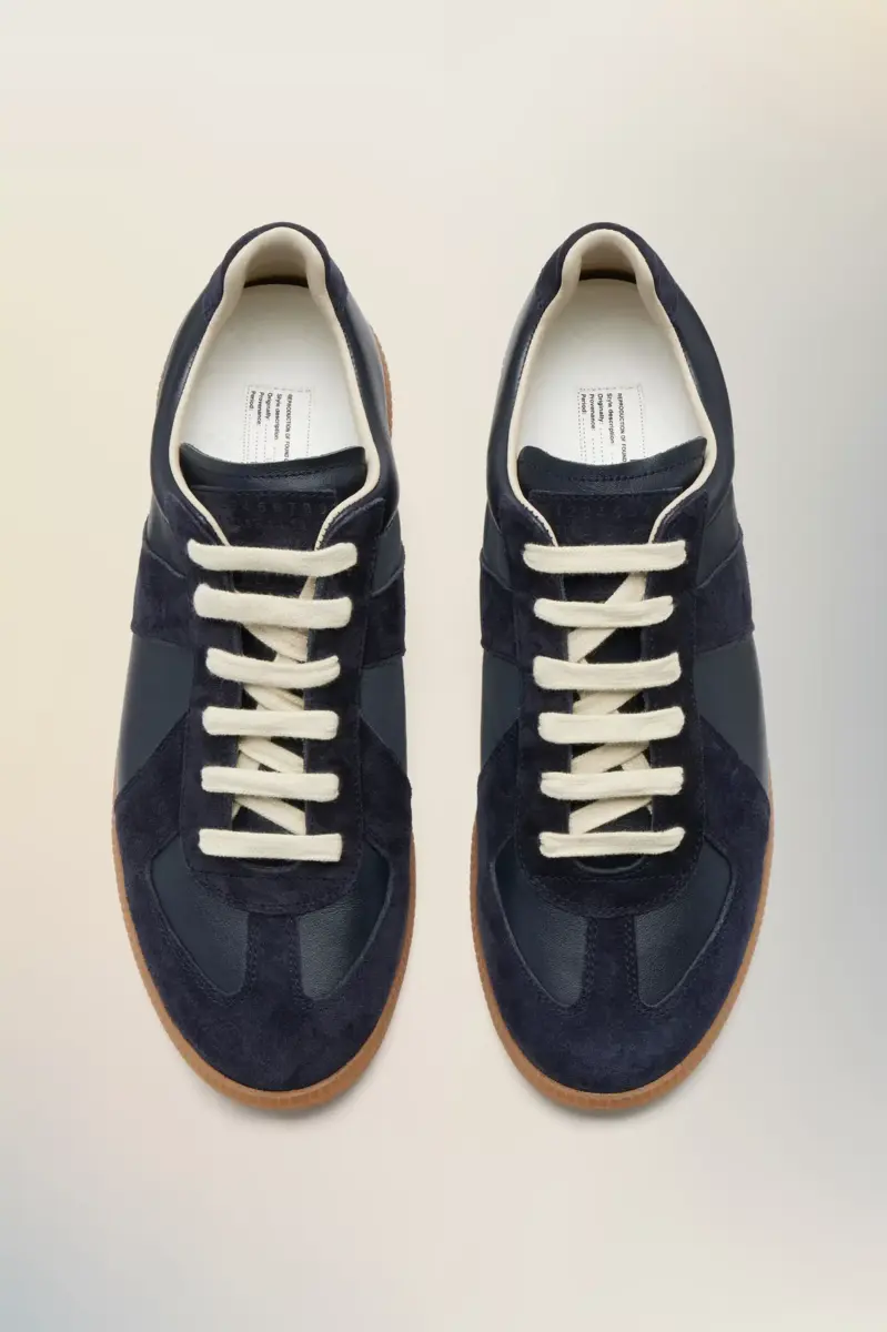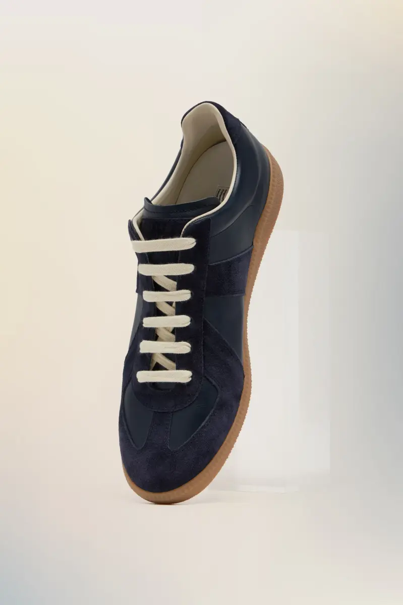 The Replica sneakers in nappa leather and suede with a honey sole. The Maison’s iconic Replica sneakers are inspired by Austrian sports shoes from the seventies. Details on the Replica pairs are continually reworked in line with the season’s inspirations.