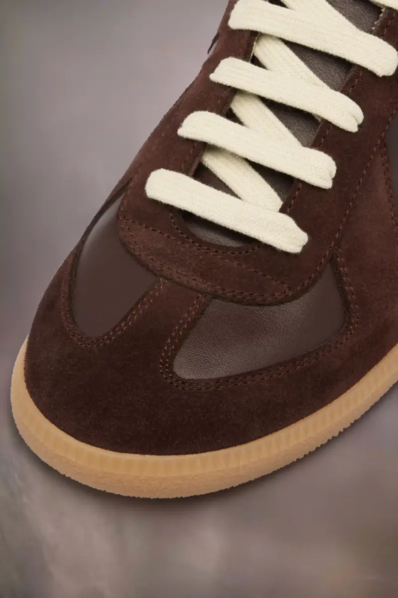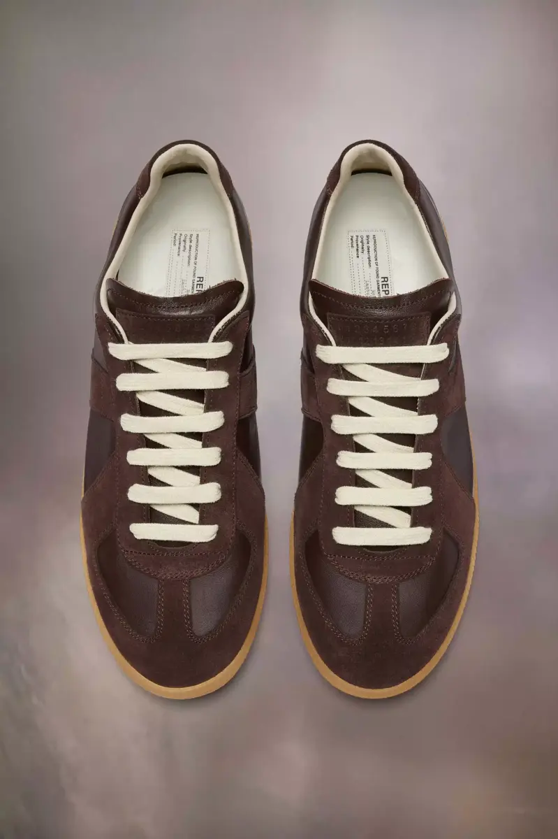 The Replica sneakers in nappa leather and suede with a honey sole. The Maison’s iconic Replica sneakers are inspired by Austrian sports shoes from the seventies. Details on the Replica pairs are continually reworked in line with the season’s inspirations.