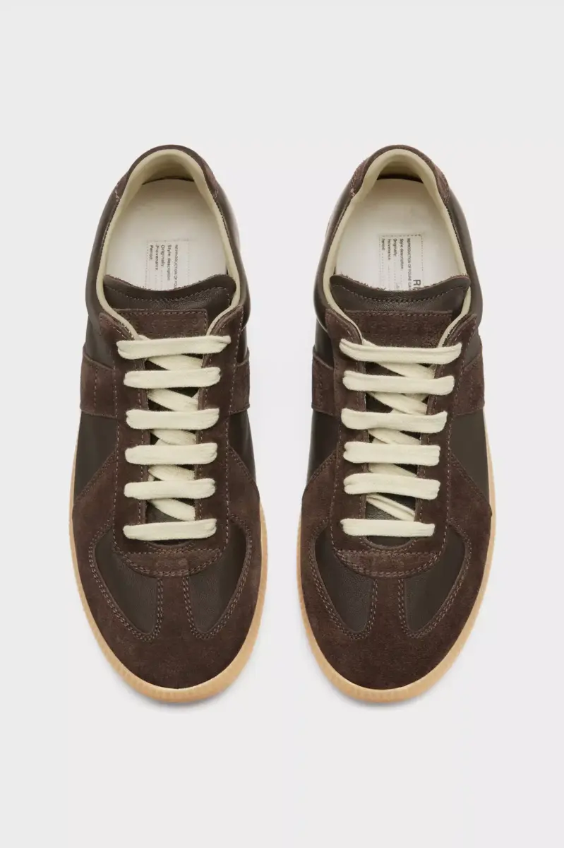 The Replica sneakers in nappa leather and suede with a honey sole. The Maison’s iconic Replica sneakers are inspired by Austrian sports shoes from the seventies. Details on the Replica pairs are continually reworked in line with the season’s inspirations.