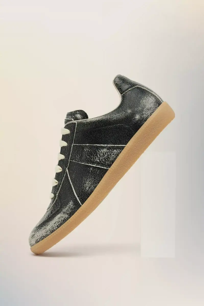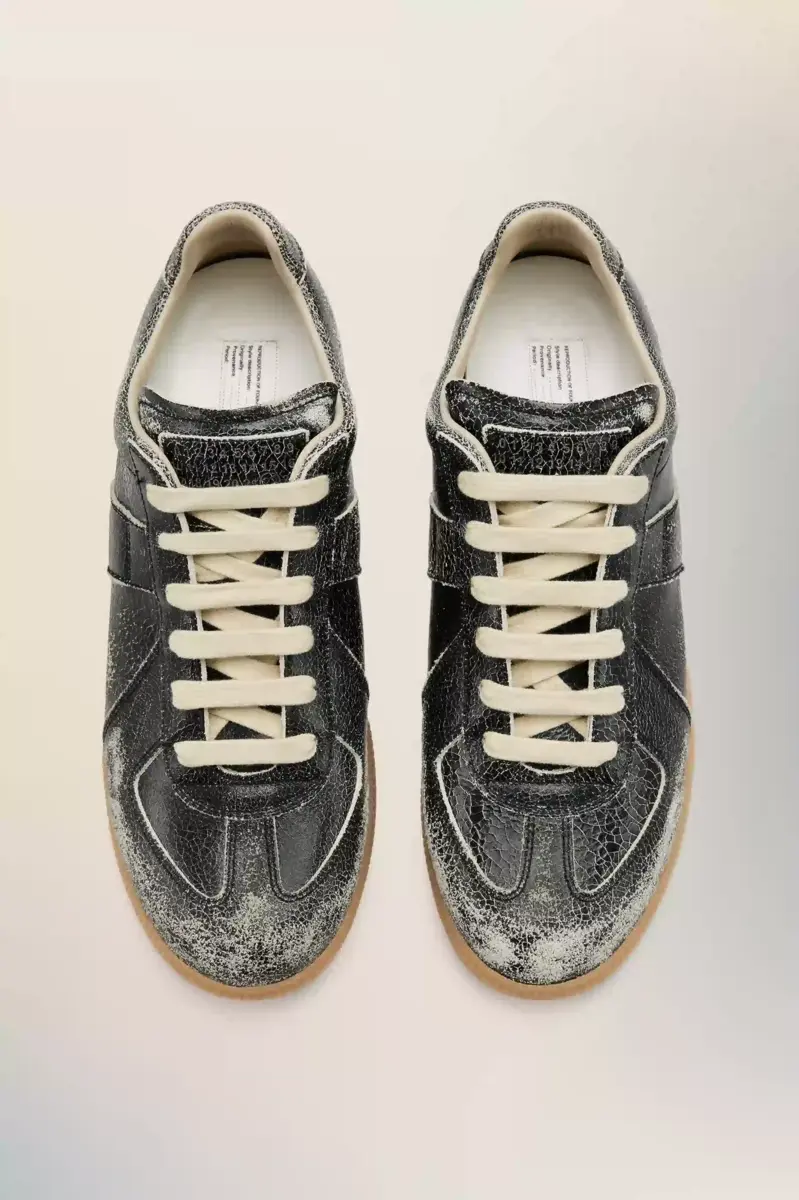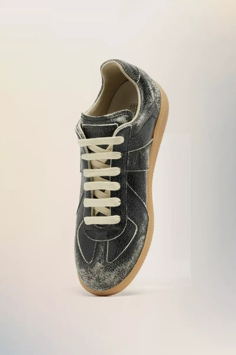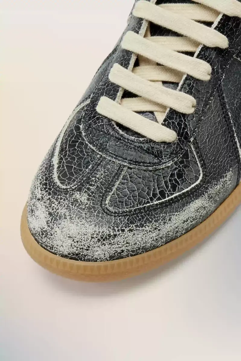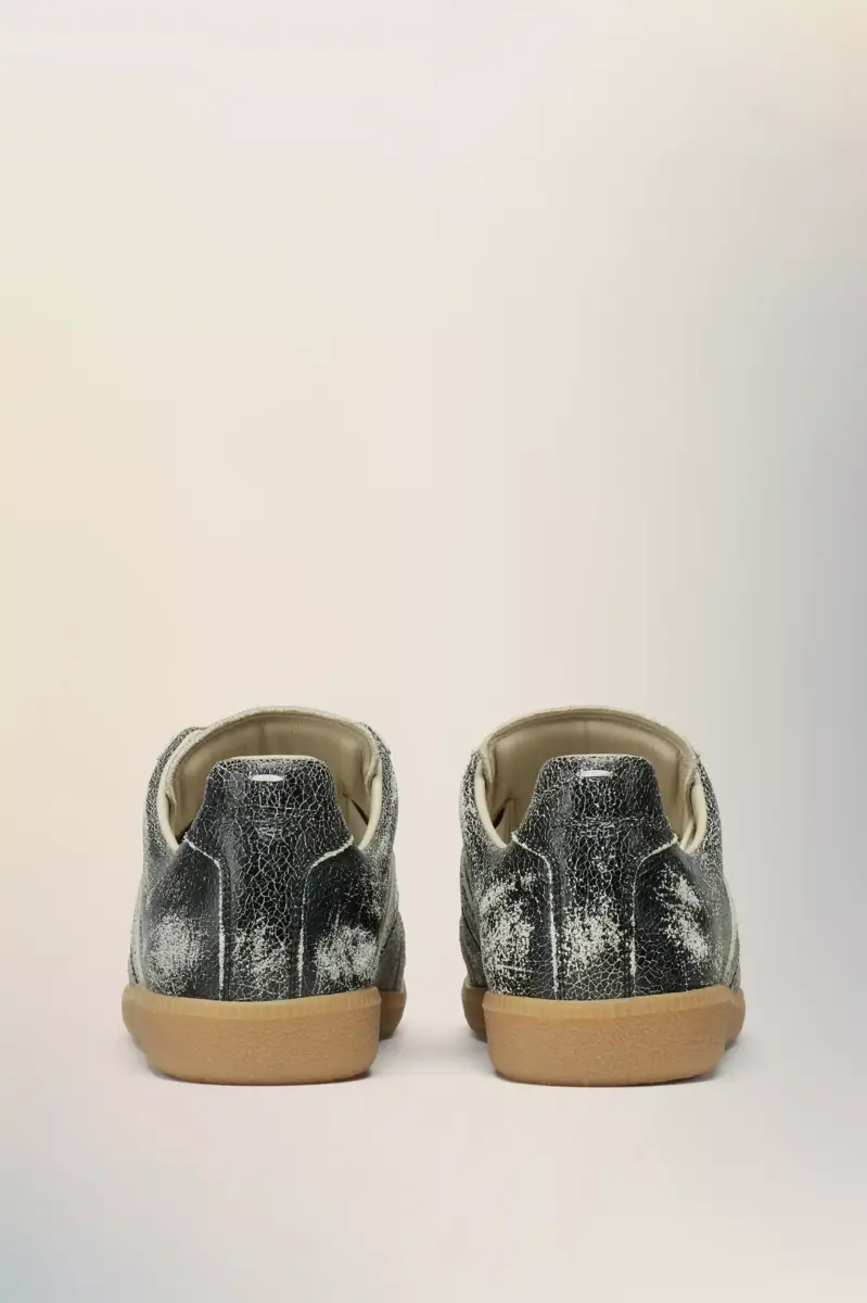 This Replica sneaker is crafted in crackled leather, creating a worn-in surface that evokes archival familiarity. The Maison’s iconic Replica sneakers are inspired by Austrian sports shoes from the seventies. Details on the Replica pairs are continually reworked in line with the season’s inspirations. Maison Margiela’s signature white stitch appears at the back.