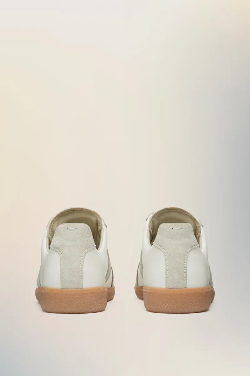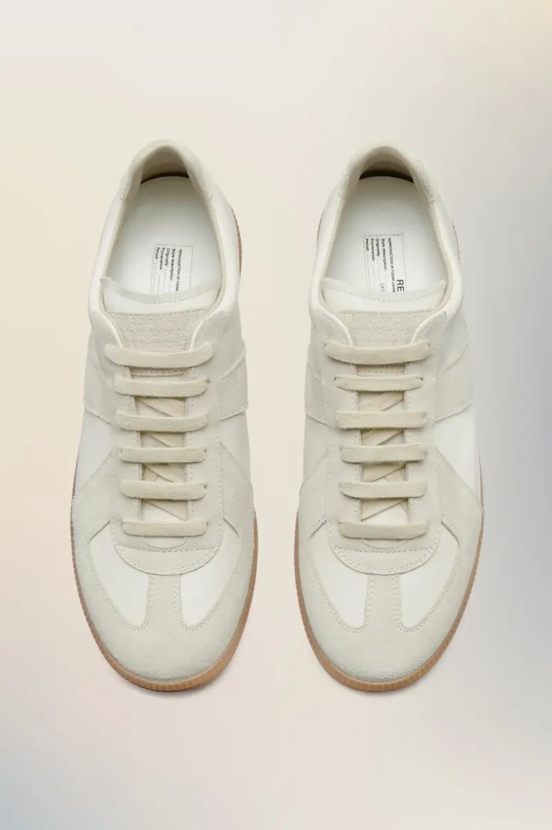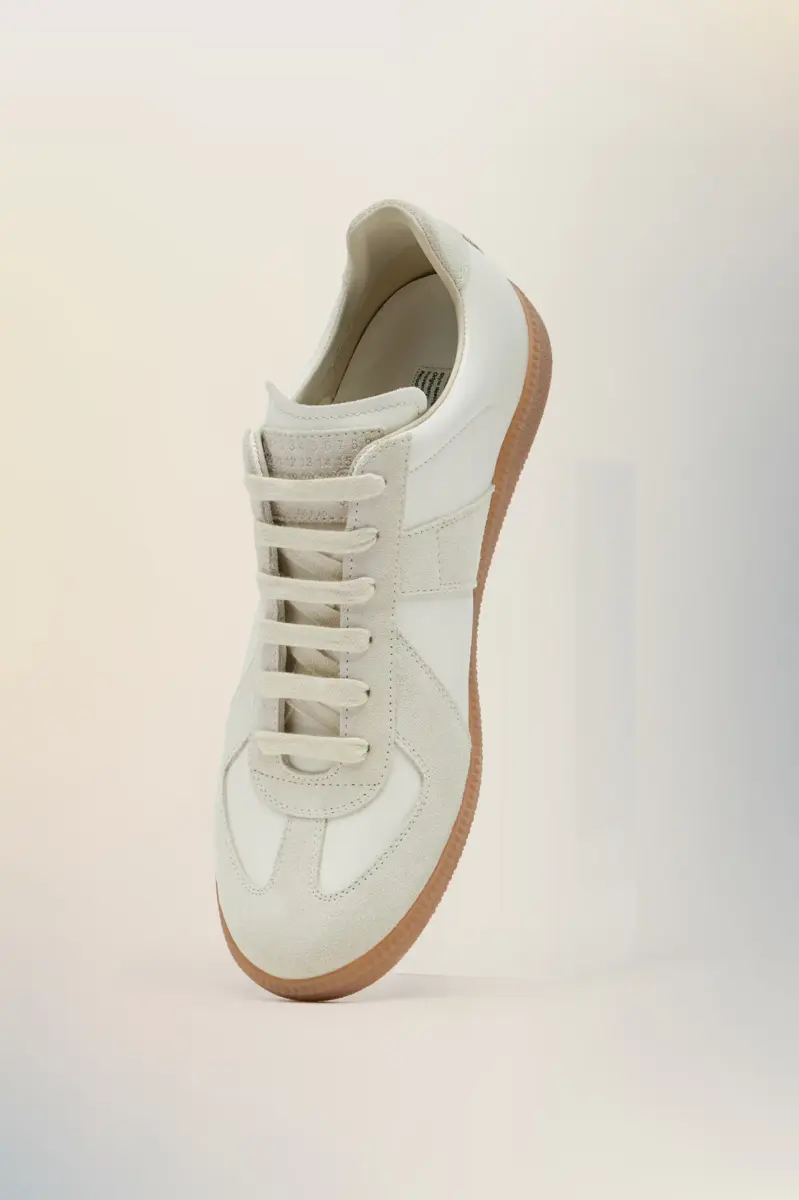 The Replica sneakers in nappa leather and suede with a honey sole. The Maison’s iconic Replica sneakers are inspired by Austrian sports shoes from the seventies. Details on the Replica pairs are continually reworked in line with the season’s inspirations.
