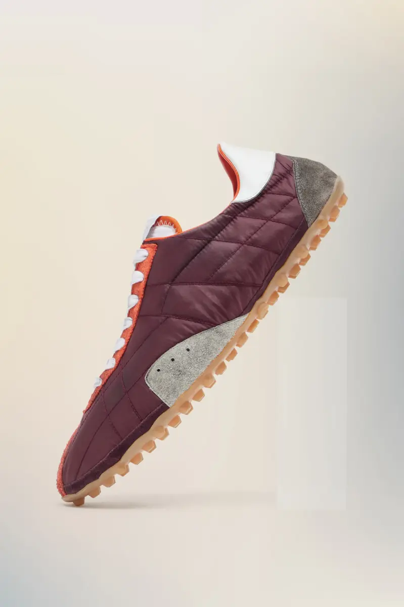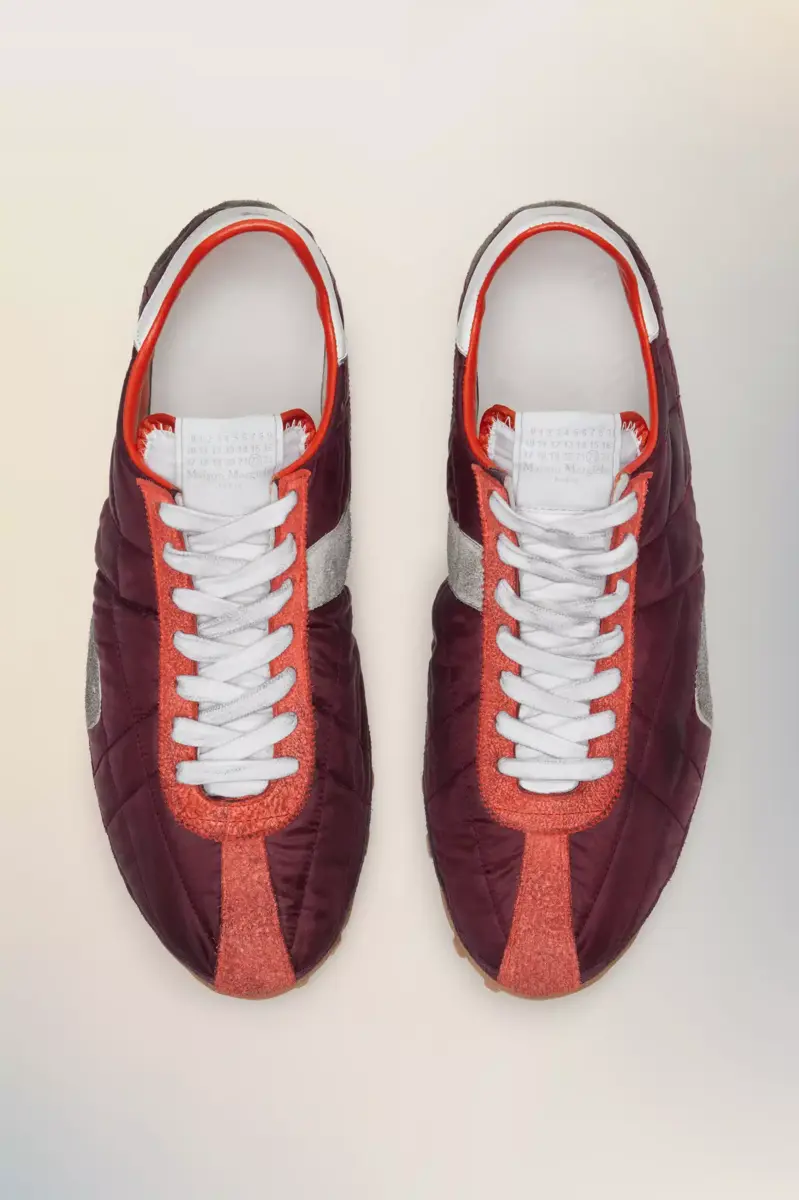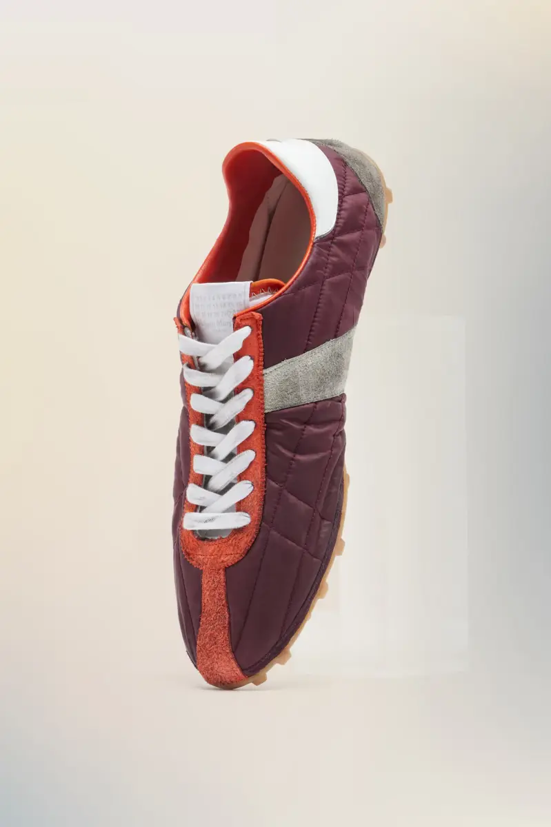 Inspired by 1960s spike shoes, the Sprinters redefine retro athleticism through exaggerated textural contrasts. The uppers, crafted from quilted fabric and hairy suede, are accentuated by a bold contrast heel and precisely stitched panels. A subtle numeric logo appears on the tongue, while the outsole bears the Maison’s footwear code, 22.Maison Margiela’s signature white stitch appears at the back; the opposite of a label.