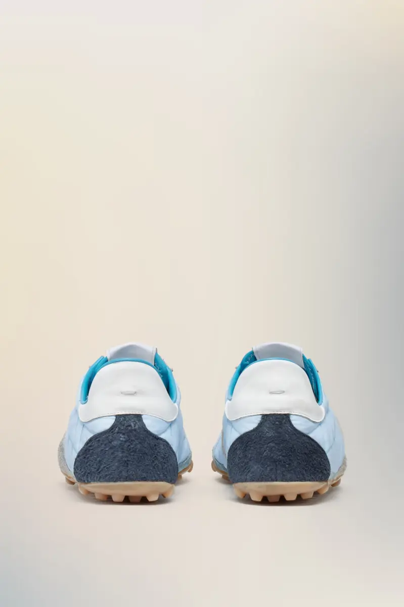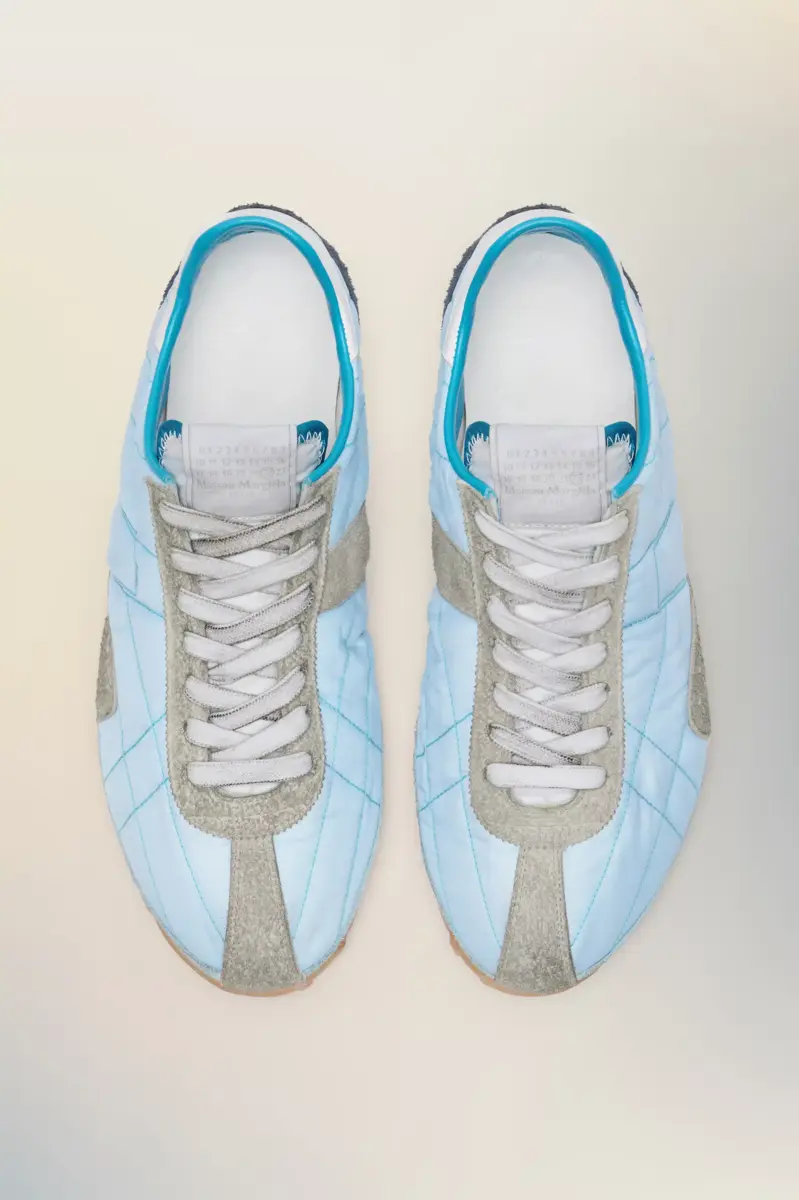 Inspired by 1960s spike shoes, the Sprinters redefine retro athleticism through exaggerated textural contrasts. The uppers, crafted from quilted fabric and hairy suede, are accentuated by a bold contrast heel and precisely stitched panels. A subtle numeric logo appears on the tongue, while the outsole bears the Maison’s footwear code, 22.Maison Margiela’s signature white stitch appears at the back; the opposite of a label.