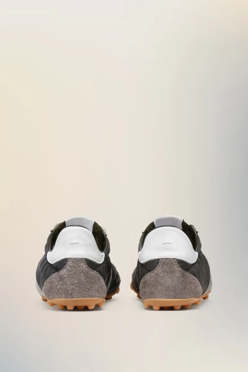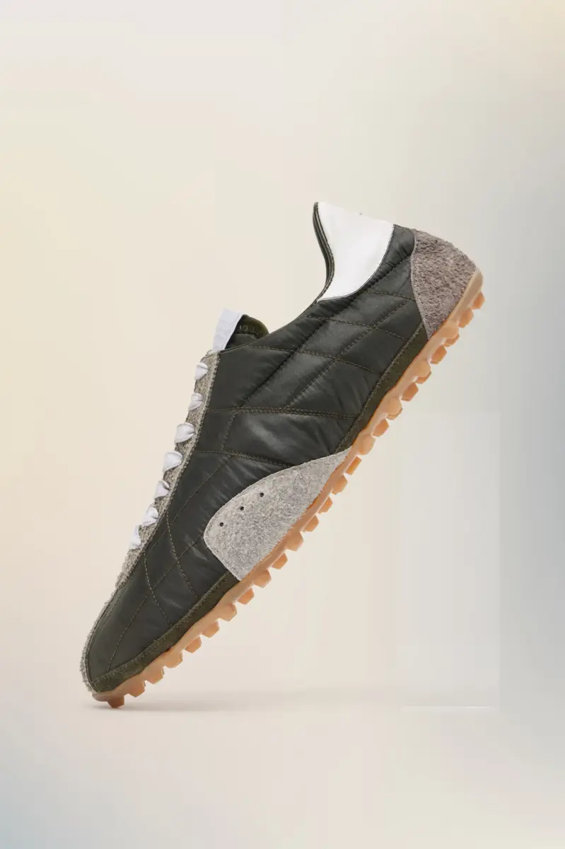 Inspired by 1960s spike shoes, the Sprinters redefine retro athleticism through exaggerated textural contrasts. The uppers, crafted from quilted fabric and hairy suede, are accentuated by a bold contrast heel and precisely stitched panels. A subtle numeric logo appears on the tongue, while the outsole bears the Maison’s footwear code, 22.Maison Margiela’s signature white stitch appears at the back; the opposite of a label.