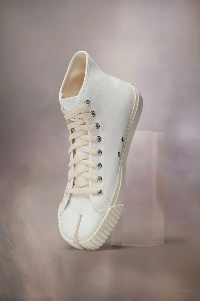 The Tabi high-top sneakers in canvas have a cleated sole front. They feature the Tabi split-toe, inspired by the traditional 15th century Japanese sock bearing the same name – launched for the Maison’s debut collection in 1989. It captures the avant-garde and insubordinate spirit of the Maison and exists as a heritage classic, continually explored through each collection.