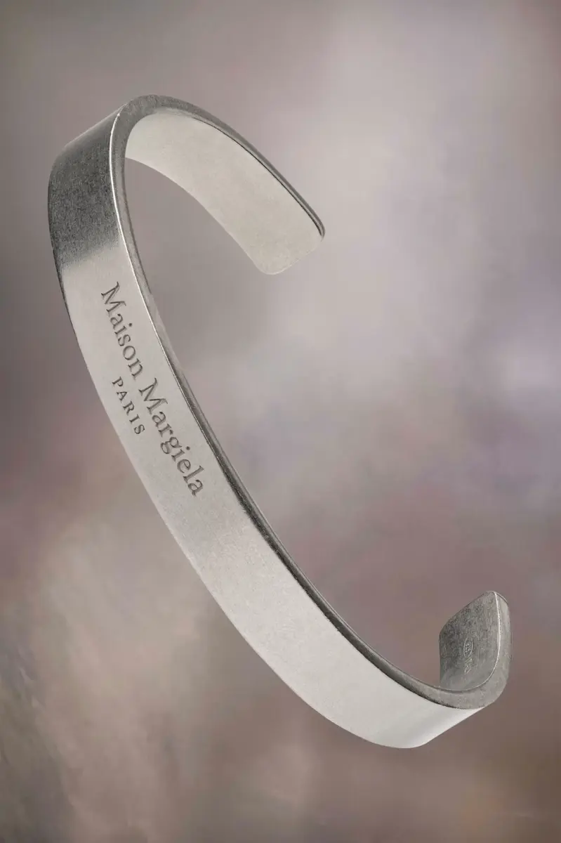 The wide cuff bracelet in silver features the Maison’s engraved logo.