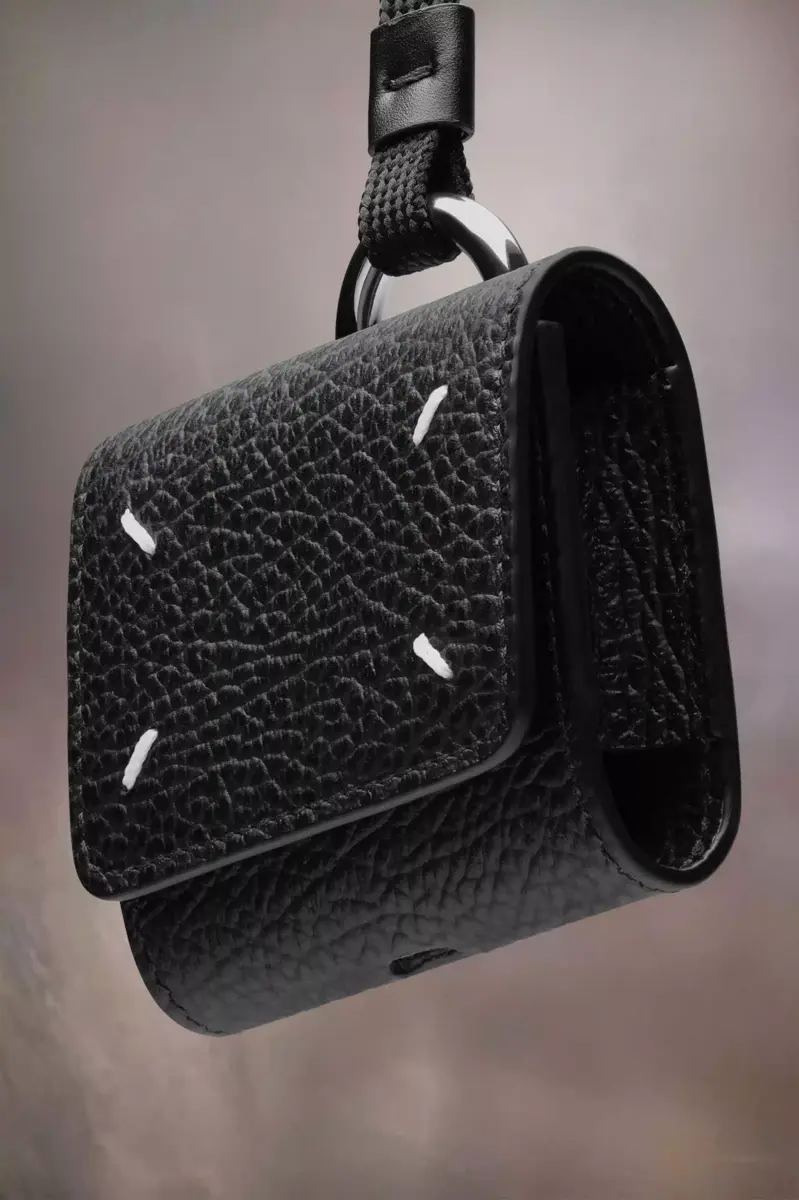 Crafted from embossed grainy leather, the AirPod case has a snap closure with inner logo. It’s complete with a lace and ring for ease of wear. Maison Margiela’s signature, the Four stitches, appear on the flap; the opposite of a label.