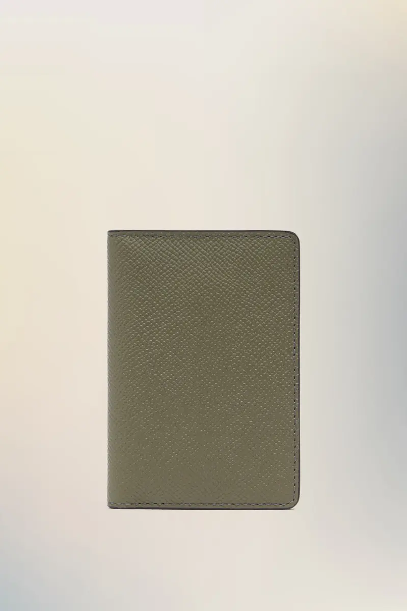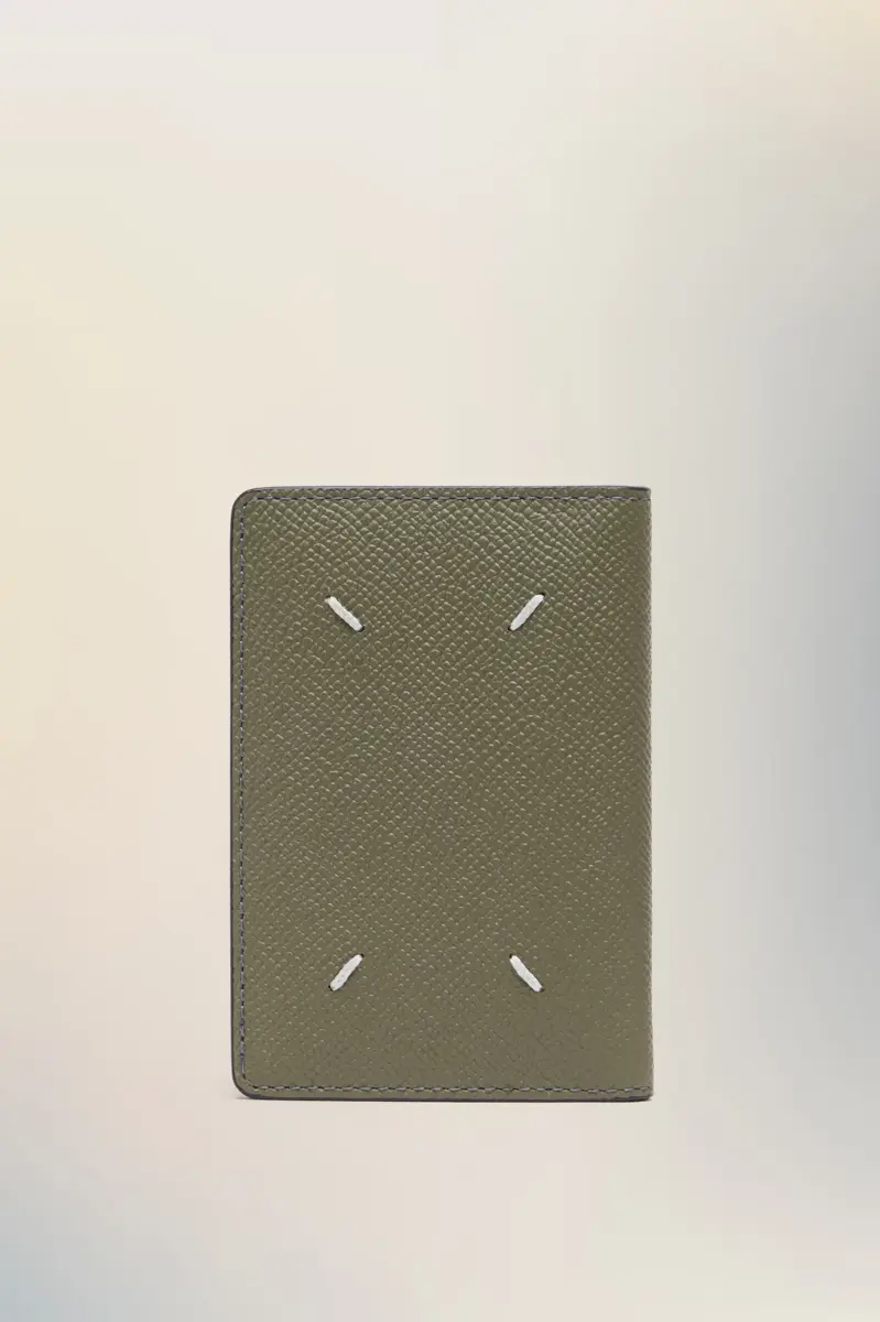 The cardholder has four card slots and sections for notes. It is crafted from grainy leather with the logo inside. Maison Margiela’s signature, the four stitches, appear on the back; the opposite of a label.