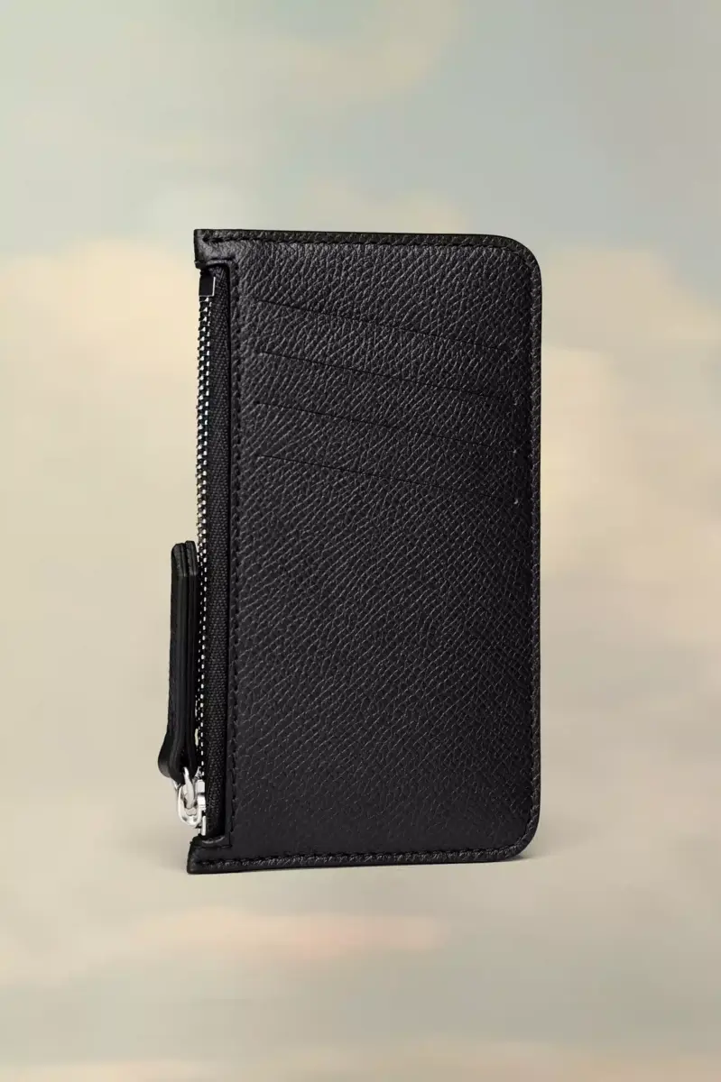 With four card holders on the side and a zipped main body, the cardholder is crafted from grainy leather. The logo appears inside. Maison Margiela’s signature, the four stitches, appear on the back; the opposite of a label.
