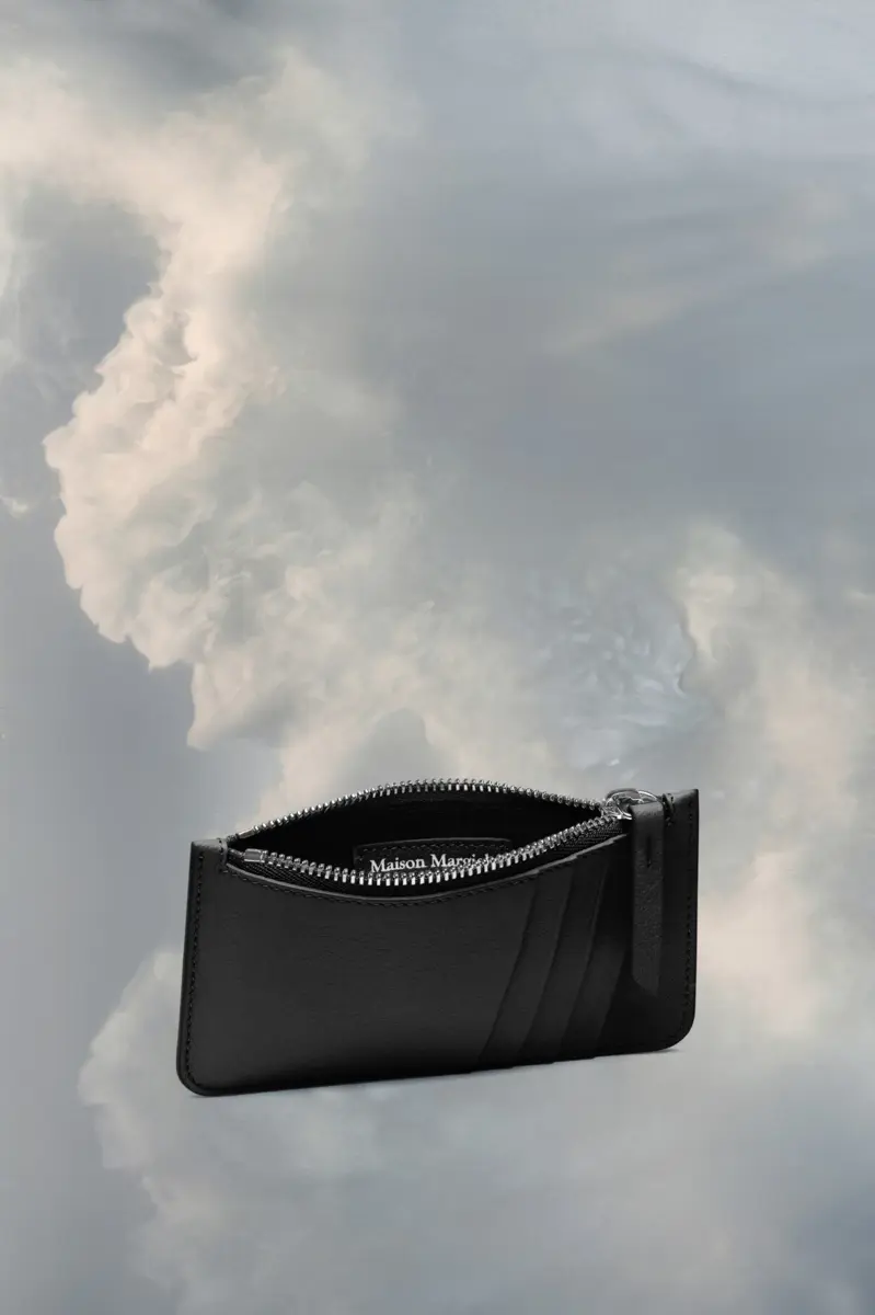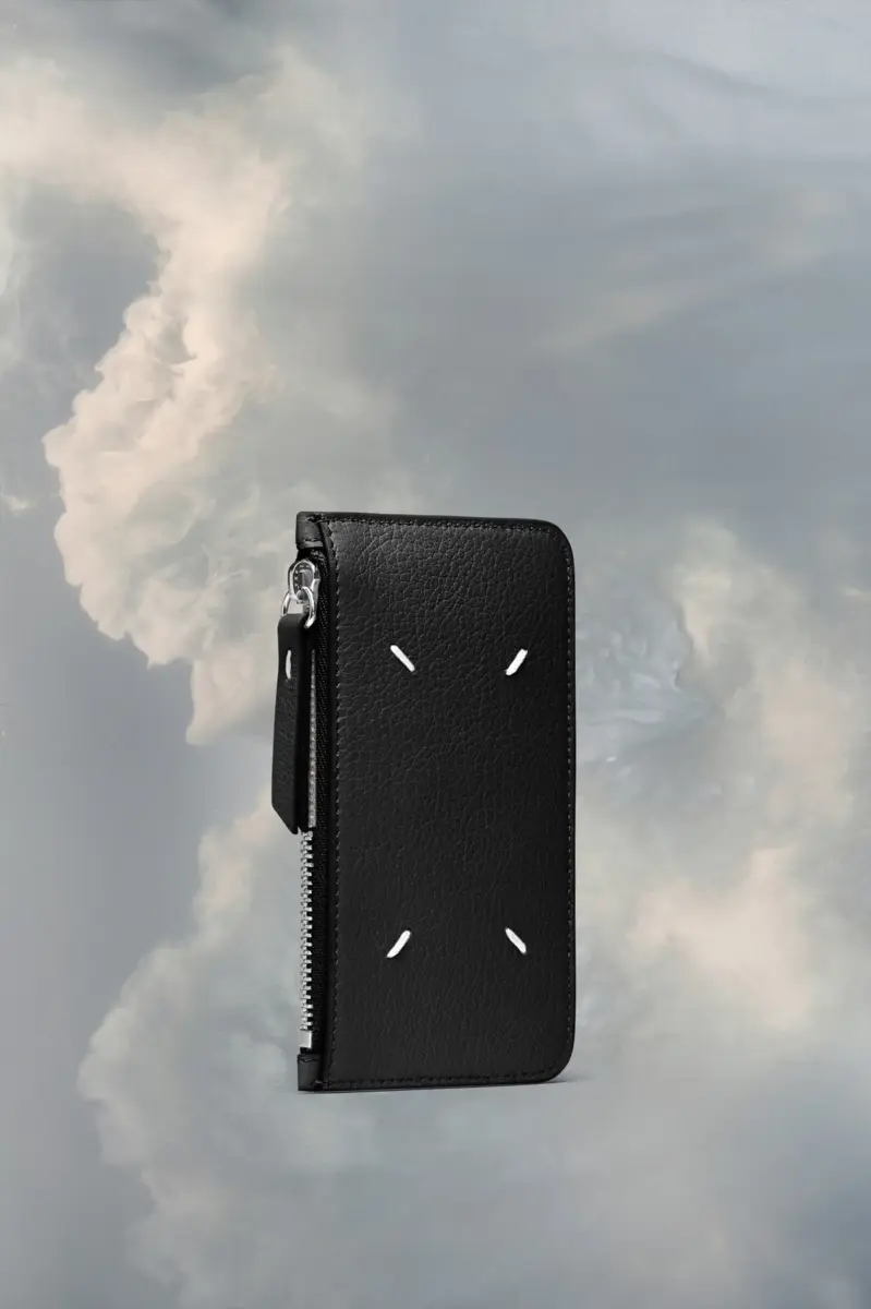 The goat leather long cardholder with zipped main section features four card slots. Maison Margiela’s signature, the four stitches, appear on the back; the opposite of a label.