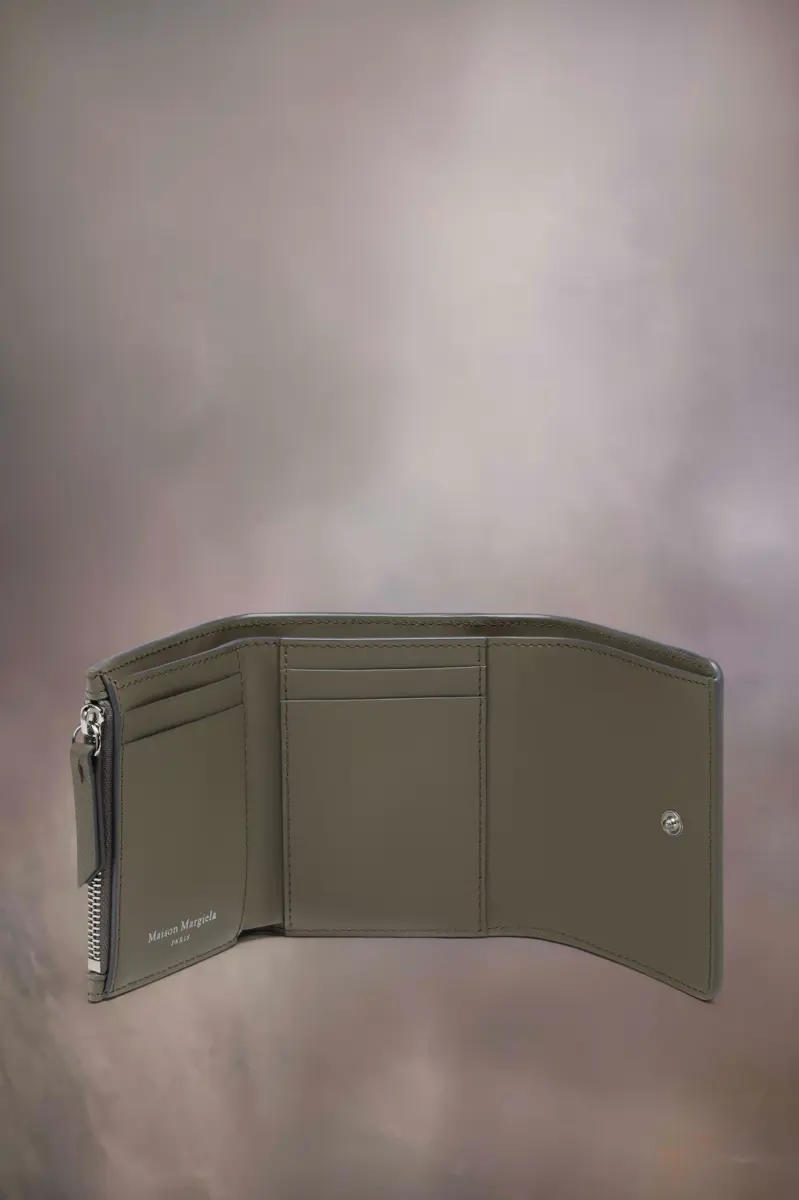 With a snap button closure, the wallet comes in grainy leather. Maison Margiela’s signature, the four stitches, appear on the flap; the opposite of a label.