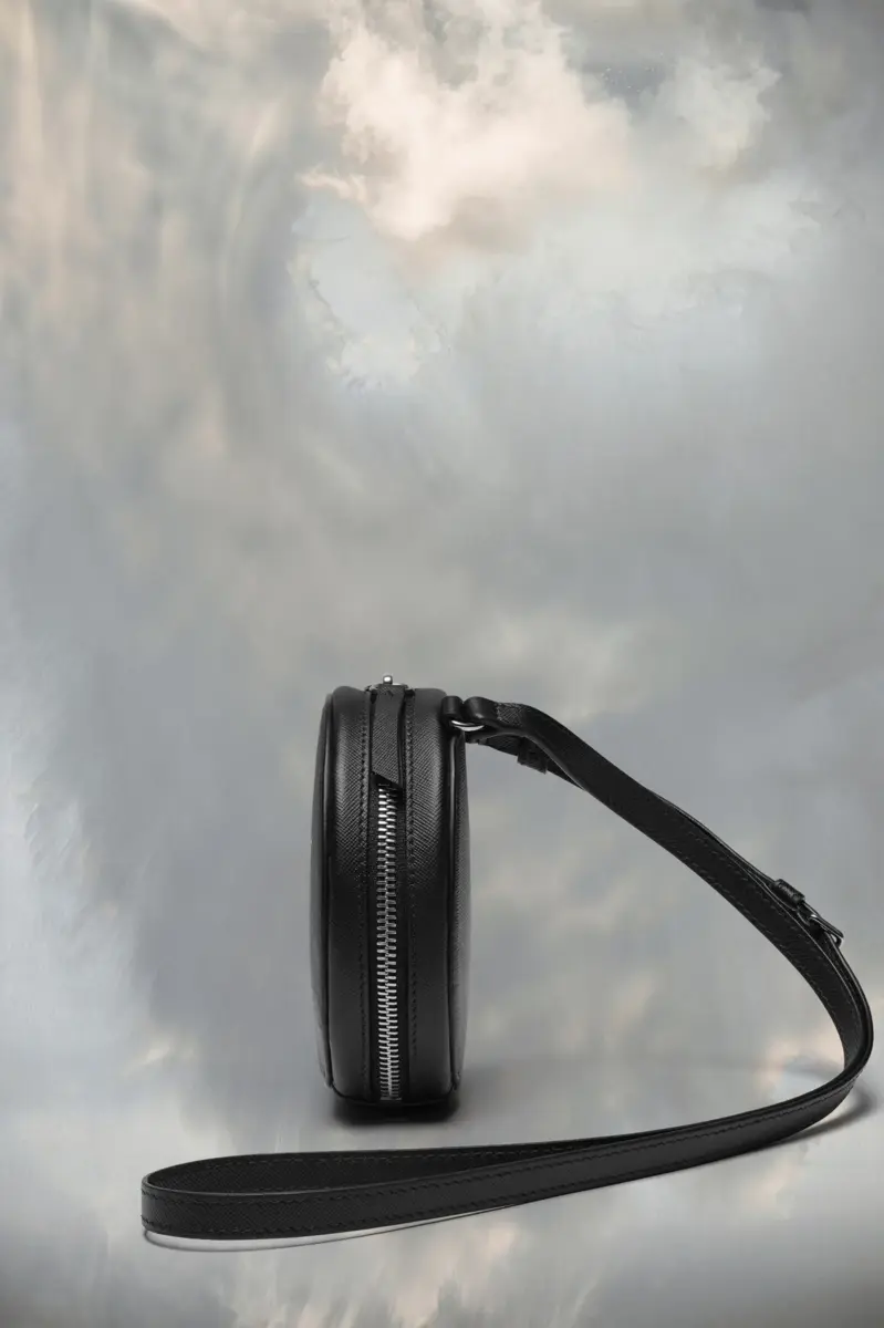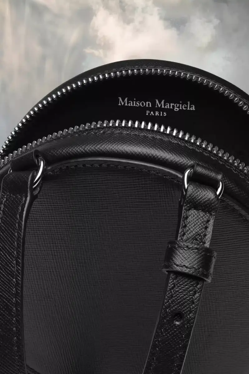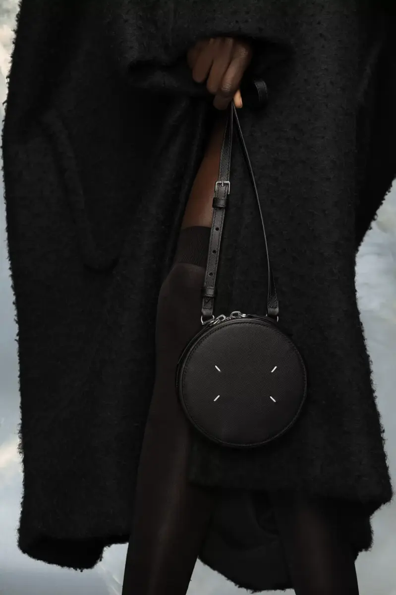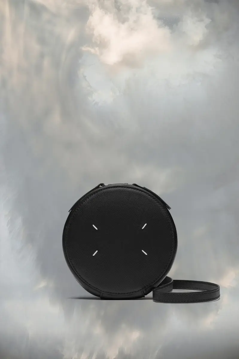 With an adjustable shoulder strap, the mini circular bag comes in calf leather with metallic hardware detailing and an inside mirror. Maison Margiela’s signature Four stitches appear on the front; the opposite of a label.