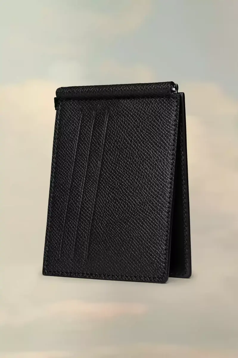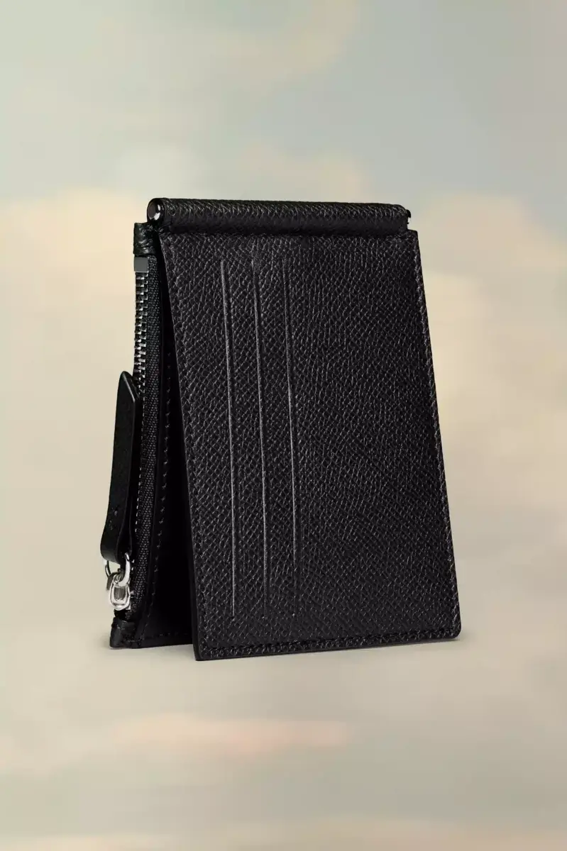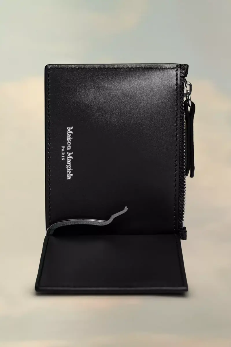 In grainy leather, the wallet features a money clip and zipped coin section. The logo appears inside. Maison Margiela’s signature, the four stitches, appear on the back; the opposite of a label.