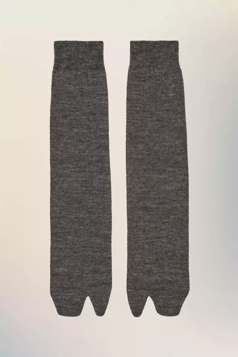 The jersey-wool Tabi crew-length socks feature a single white stitch showing the hand of Maison Margiela. The Tabi split-toe is inspired by the traditional 15th century Japanese sock bearing the same name – launched for the Maison’s debut collection in 1989. It captures the avant-garde and insubordinate spirit of the Maison and exists as a heritage classic, continually explored through each collection. Gauge 18.