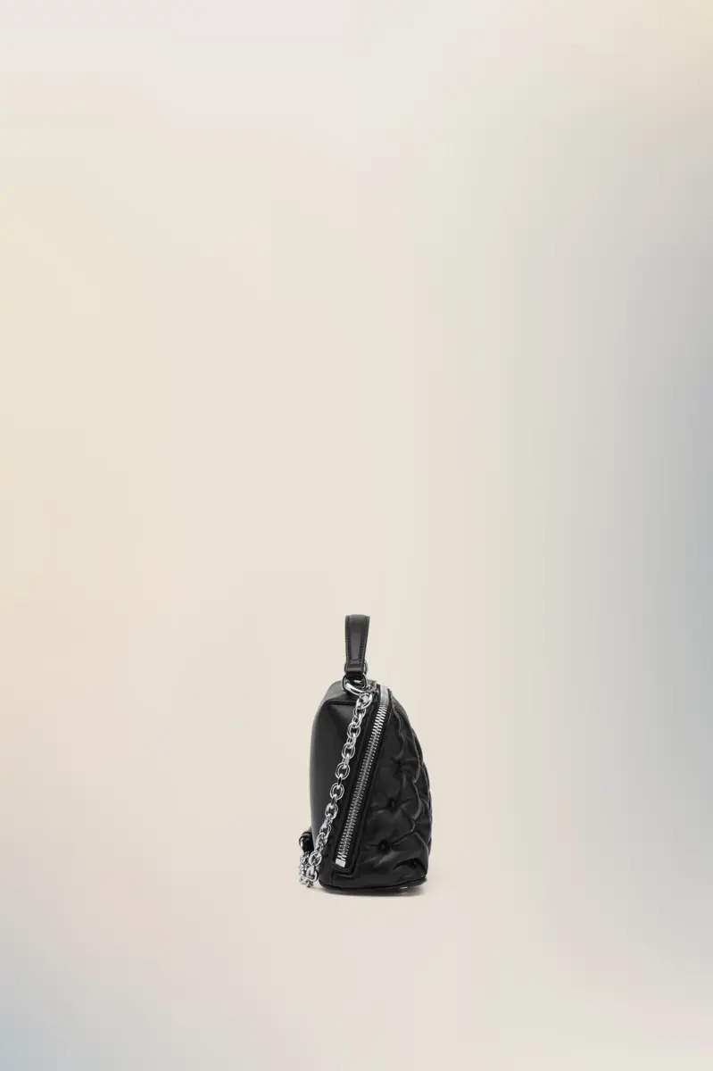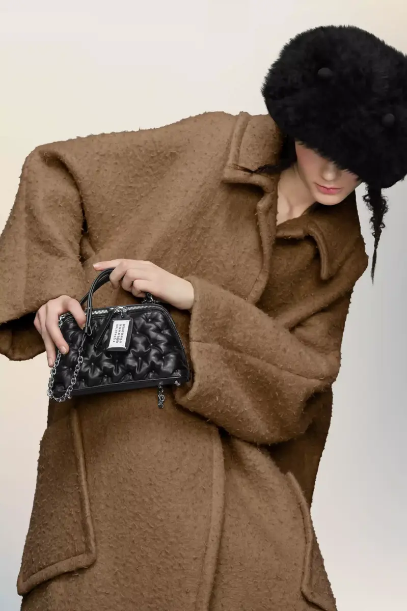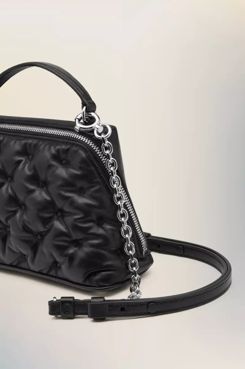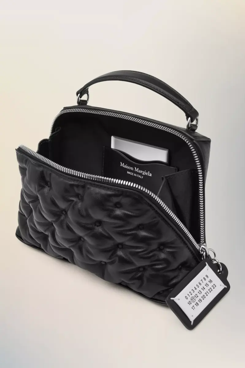 The Glam Slam trapezoid bag is crafted from embroidered nappa leather. The Glam Slam debuted in the SS18 show and has a quilted design which mimics matelassé – the style of hand-stitched quilts created in Marseilles, France. The concept reflects the Maison’s notion of unconscious glamour and evokes its association to comfort, following the study into dressing and travelling rituals worldwide. This style features a top handle, detachable chain shoulder strap, and is adorned with the numeric logo label on the zip pull.
