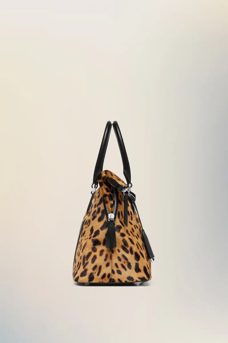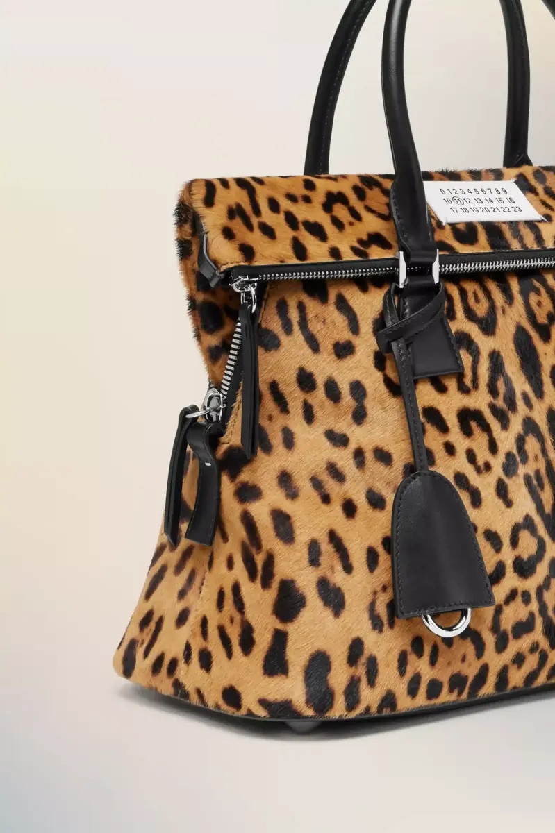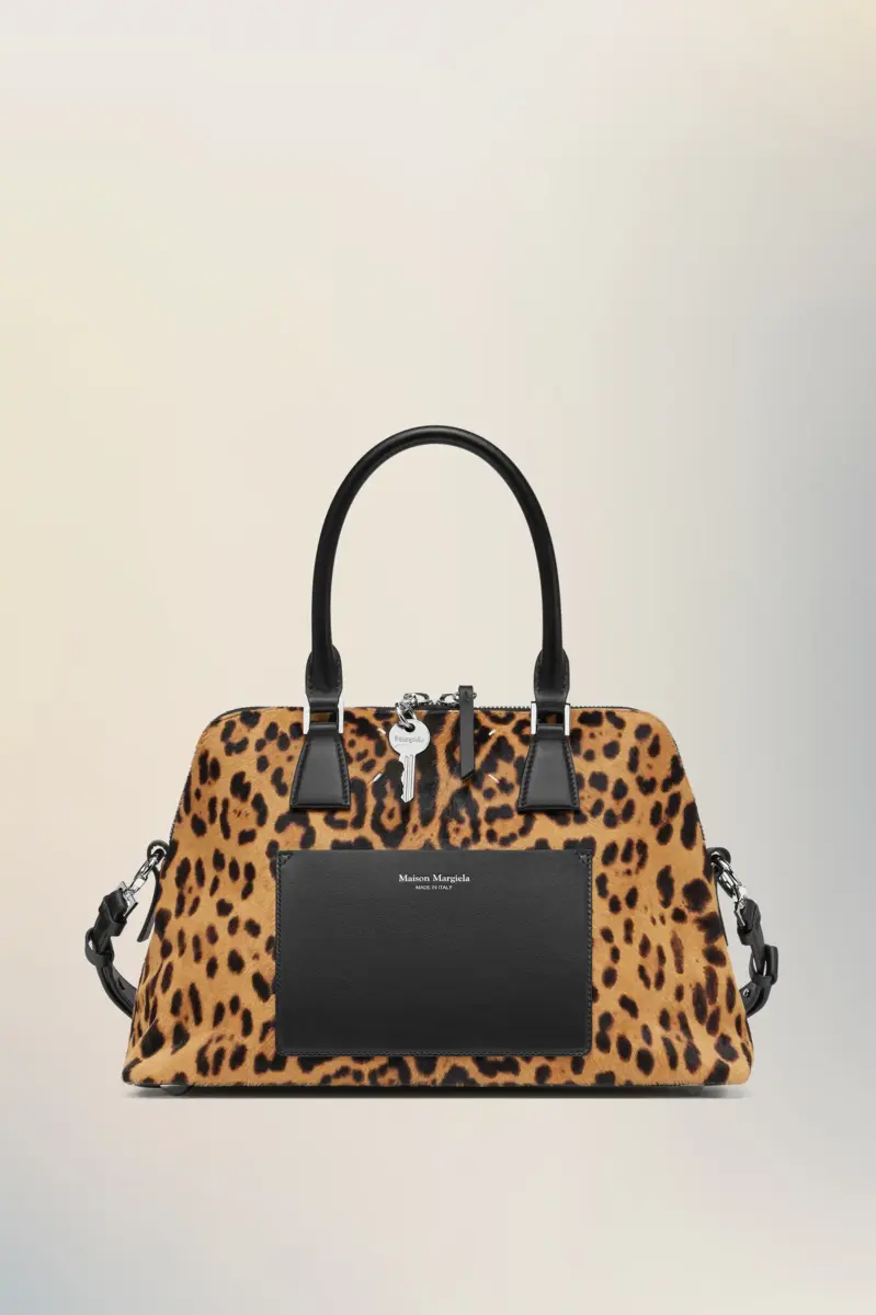 The 5AC medium fuses precision with provocation in bold leopard-print. Black leather trim frames the silhouette, grounding the tactile finish with structured contrast. The iconic 5AC line takes its name from the French word ‘sac’ (bag). It explores the Maison’s Anonymity of the Lining concept. Accented with the Maison’s numeric artwork and four stitches – the opposite of a label.